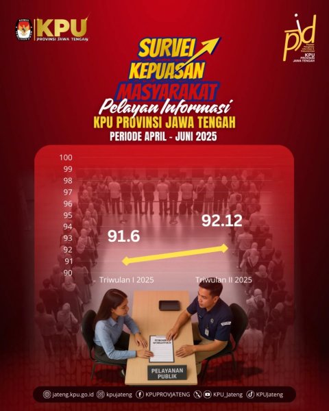 Pada periode triwulan II tahun 2025, penilaian atas SKM pelayanan informasi, KPU Provinsi Jawa Tengah memperoleh nilai 92.12. Angka ini naik dibanding penilaian di triwulan I (Januari-Maret) yang sebesar 91.6.