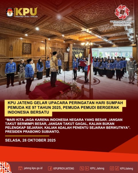 Semarang— Komisi Pemilihan Umum (KPU) Provinsi Jawa Tengah menggelar upacara peringatan Hari Sumpah Pemuda ke-97, Senin (28/10/2025), di Lobby kantor KPU Provinsi Jawa Tengah, Semarang. Ketua KPU Provinsi Jawa Tengah, Handi Tri Ujiono, bertindak sebagai pemimpin upacara. Dalam kesempatan itu, Handi membacakan sambutan resmi Menteri Pemuda dan Olahraga Republik Indonesia (Menpora) pada peringatan Hari Sumpah Pemuda Tahun 2025.