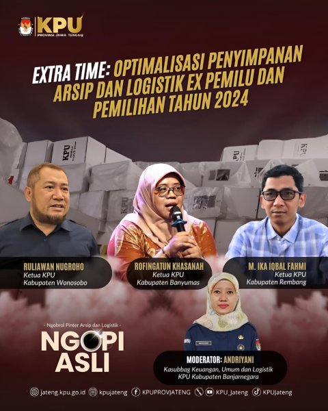 Komisi Pemilihan Umum (KPU) Provinsi Jawa Tengah menggelar forum diskusi mingguan bertajuk Ngopi Asli (Ngobrol Pinter Arsip dan Logistik) secara daring pada Selasa (28/10/2025). Diskusi kali ini mengangkat tema “Optimalisasi Penyimpanan Arsip dan Logistik Ex Pemilu dan Pemilihan Tahun 2024” sebagai bagian dari upaya memperkuat tata kelola pascapemilu di tingkat daerah.