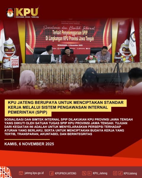 Semarang —Komisi Pemilihan Umum (KPU) Provinsi Jawa Tengah melaksanakan kegiatan Sosialisasi dan Bimbingan Teknis (Bimtek) Internal bagi Satuan Tugas Sistem Pengawasan Intern Pemerintah (Satgas SPIP) KPU Jateng pada Kamis, 6 November 2025 . Kegiatan ini digelar sebagai upaya memperkuat penerapan tata kelola pemerintahan yang baik serta meningkatkan efektivitas pengendalian intern di lingkungan KPU Jawa Tengah.