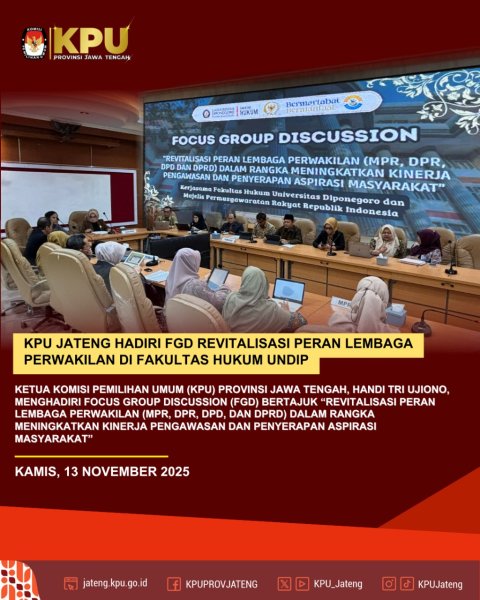 Semarang— Ketua Komisi Pemilihan Umum (KPU) Provinsi Jawa Tengah, Handi Tri Ujiono, menghadiri Focus Group Discussion (FGD) bertajuk “Revitalisasi Peran Lembaga Perwakilan (MPR, DPR, DPD, dan DPRD) dalam Rangka Meningkatkan Kinerja Pengawasan dan Penyerapan Aspirasi Masyarakat” yang diselenggarakan oleh Fakultas Hukum Universitas Diponegoro, Kamis (13/11/2025), di Semarang.