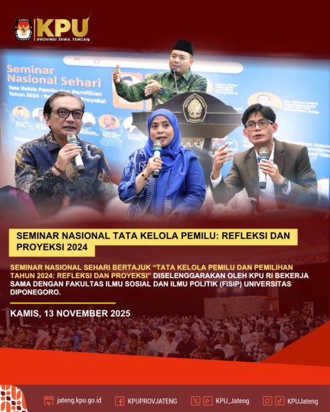 Semarang — Komisi Pemilihan Umum (KPU) Provinsi Jawa Tengah hadir dalam Seminar Nasional Sehari bertajuk “Tata Kelola Pemilu dan Pemilihan Tahun 2024: Refleksi dan Proyeksi” yang diselenggarakan oleh KPU RI bekerja sama dengan Fakultas Ilmu Sosial dan Ilmu Politik (FISIP) Universitas Diponegoro, Kamis (13/11/2025), di Auditorium FISIP Undip, Semarang.