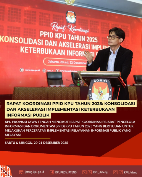 KPU Provinsi Jawa Tengah mengikuti kegiatan Rapat Koordinasi Pejabat Pengelola Informasi dan Dokumentasi (PPID) yang dilaksanakan oleh KPU Republik Indonesia yang bertempat di Jakarta 20-21 Desember 2025.