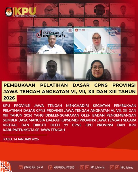 KPU Provinsi Jawa Tengah mengikuti kegiatan Pembukaan Pelatihan Dasar CPNS Provinsi Jawa Tengah angkatan VI, VII, XII dan XIII Tahun 2026 pada hari Rabu, 14 Januari 2026 yang diselenggarakan oleh Badan Pengembangan Sumber Daya Manusia Daerah (BPSDMD) Provinsi Jawa Tengah secara Virtual dan diikuti oleh 99 CPNS KPU Provinsi dan KPU Kabupaten/Kota se-Jawa Tengah.. Kegiatan dihadiri oleh Ibu Kiki Rizka Ningsih, S.H.,M.H. selaku Kepala Bagian Parmas dan SDM KPU Provinsi Jawa Tengah.