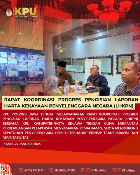 Semarang, 22 Januari 2026 - KPU Provinsi Jawa Tengah, menyelenggarakan Rapat Koordinasi Progres Pengisian LKHPN secara daring. Pada rapat kali ini hadir jajaran Anggota dan Sekretaris KPU Kabupaten/Kota se-Jawa Tengah.