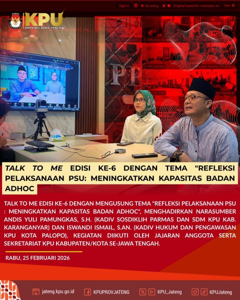 Semarang, 25 Februari 2026 - Talk To Me Edisi ke-6 dengan mengusung tema "Refleksi Pelaksanaan PSU : Meningkatkan Kapasitas Badan Adhoc", menghadirkan narasumber Andis Yuli Pamungkas, S.H. (Kadiv Sosdiklih Parmas dan SDM KPU Kab. Karanganyar) dan Iswandi Ismail, S.AN. (Kadiv Hukum dan Pengawasan KPU Kota Palopo), kegiatan diikuti oleh jajaran Anggota serta Sekretariat KPU Kabupaten/Kota se-Jawa Tengah.