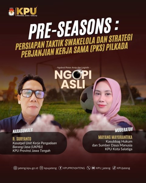 Semarang, 24 Februari 2026 – Komisi Pemilihan Umum Provinsi Jawa Tengah menggelar forum diskusi mingguan bertajuk NGOPI ASLI (Ngobrol Pinter Arsip dan Logistik) dengan tema “Pre-Seasons: Persiapan Taktik Swakelola dan Strategi Perjanjian Kerja Sama (PKS) Pilkada”. Kegiatan ini dilaksanakan secara daring dan diikuti oleh jajaran KPU kabupaten/kota se-Jawa Tengah.