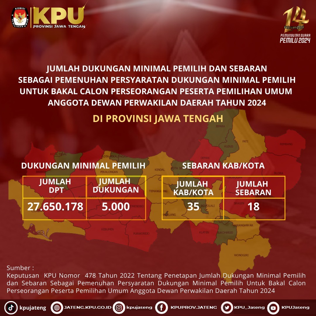 Keputusan Komisi Pemilihan Umum Nomor 478 Tahun 2022 Tentang Penetapan Jumlah Dukungan Minimal Pemilih dan Sebaran Sebagai Pemenuhan Persyaratan Dukungan Minimal Pemilih Untuk Bakal Calon Perseorangan Peserta Pemilihan Umum Anggota Dewan Perwakilan Daerah Tahun 2024 dapat diunduh disini