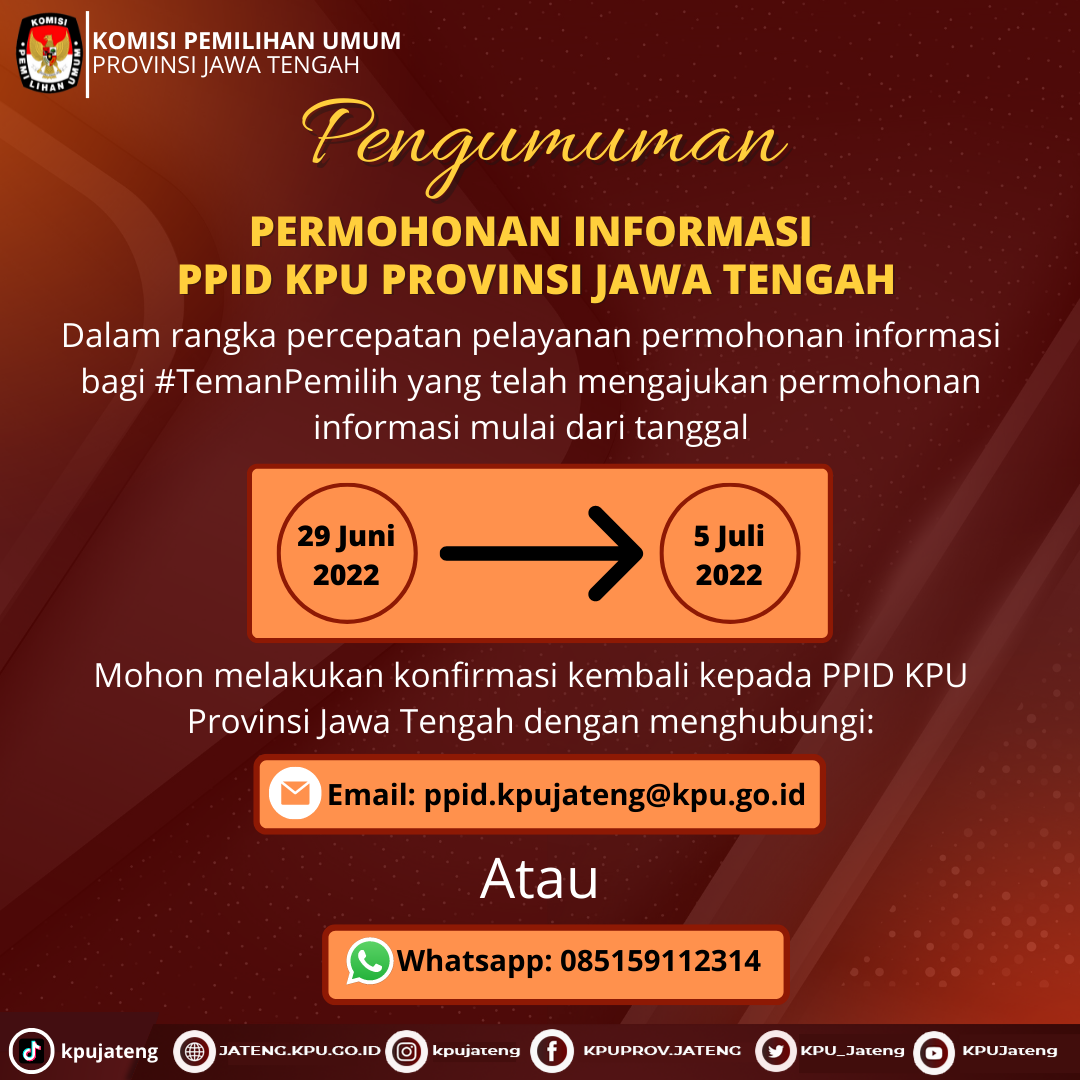 Pengumuman Pelayanan PPID KPU Provinsi Jawa Tengah Senin, 18 Juli 2022 07:00 1406 Bagikan: Telah dilihat 1,406 kali