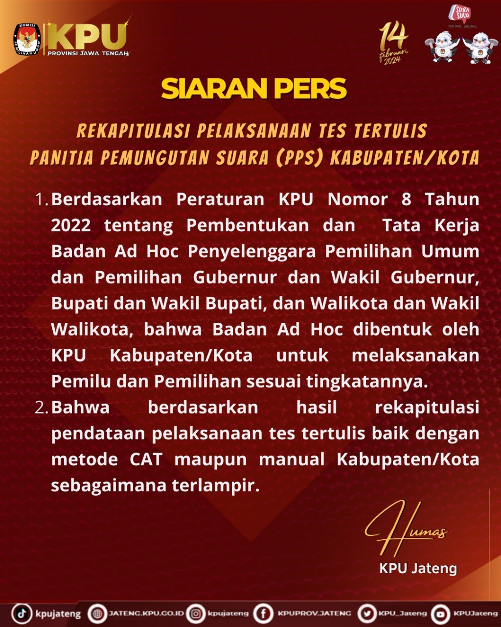 Siaran Pers terkait Rekapitulasi Pelaksanaan Tes Tertulis Panitia Pemungutan Suara (PPS) Kabupaten/Kota
