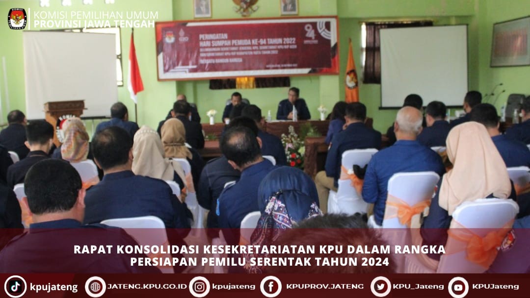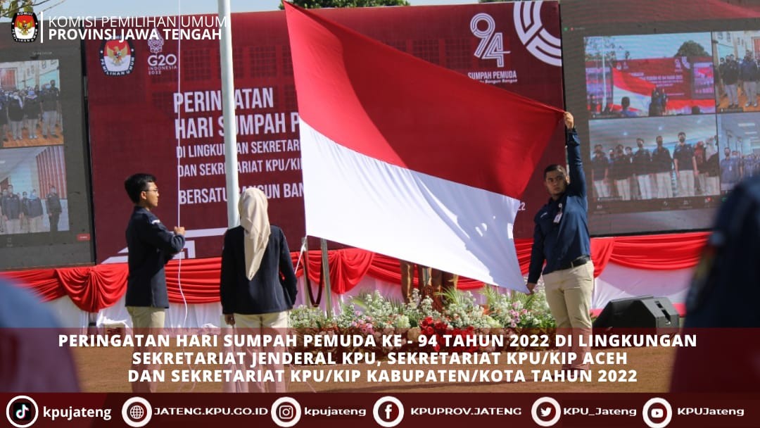 (28/10) KPU Provinsi Jawa Tengah mengikuti upacara peringatan Hari Sumpah Pemuda Ke 94 Tahun 2022 di Lingkungan Sekretariat Jenderal KPU, Sekretariat KPU/KIP Aceh, dan Sekretariat KPU/KIP Kabupaten/Kota yang diselenggarakan di Kota Salatiga. Upacara diikuti oleh Deputi, Inspektur Utama, Pejabat Eselon II, III, IV, Pejabat Fungsional, Tenaga Ahli, Jajaran KPU se-Provinsi Jawa Tengah baik secara luring di Kota Salatiga maupun secara daring di masing-masing unit kerja KPU se-Indonesia.
