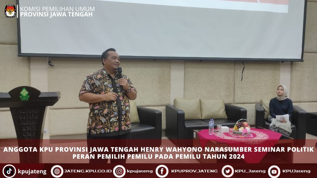 Anggota KPU Provinsi Jawa Tengah Henry Wahyono, Ketua Divisi Data dan Informasi KPU Jateng memaparkan tentang berbagai sistem informasi yang akan digunakan dalam Pemilu 2024, bagaimana masyarakat memastikan dirinya terdaftar sebagai pemilih melalui aplikasi lindungi hakmu serta prosedur yang dapat ditempuh manakala masyarakat terdaftar sebagai Anggota Partai Politik tertentu sementara merasa tidak pernah mendaftarkan diri melalui website infopemilu.kpu.go.id