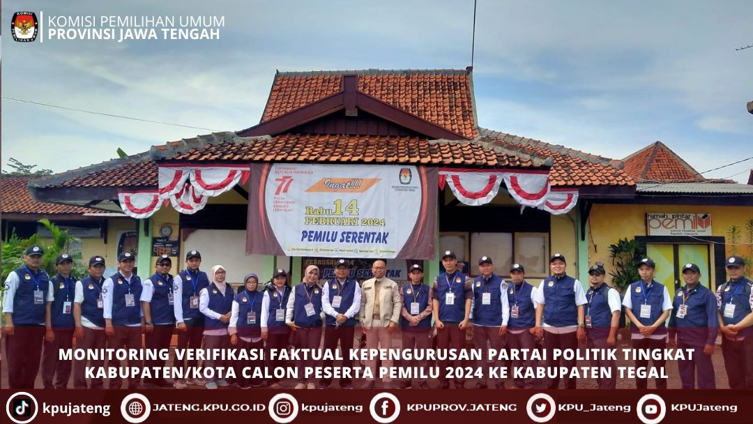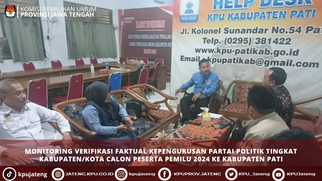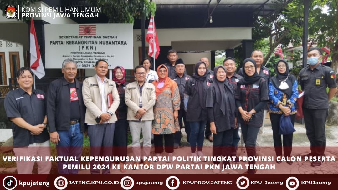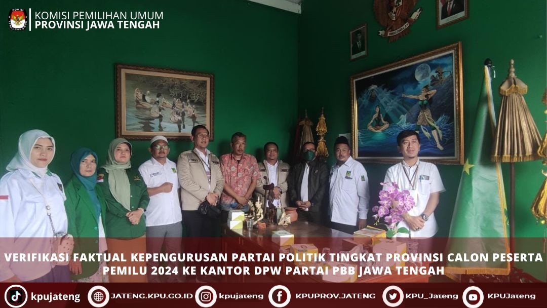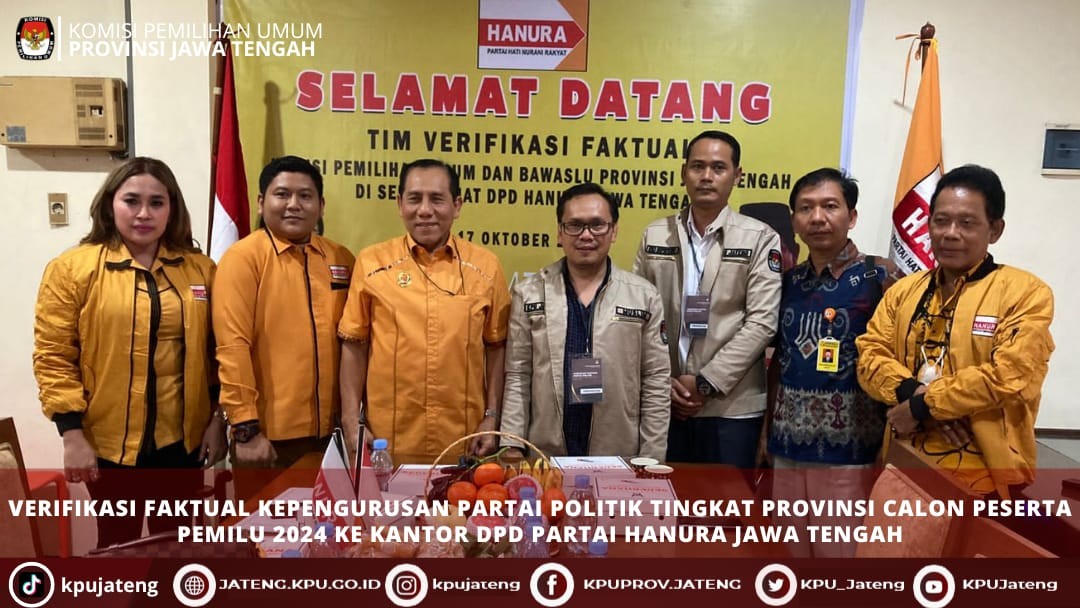 KPU Provinsi Jawa Tengah melaksanakan Verifikasi Faktual Kepengurusan Partai Politik Tingkat Provinsi Calon Peserta Pemilu 2024 ke kantor DPW Partai Persatuan Indonesia (Perindo) Jawa Tengah. Tim Verifikator dipimpin Ketua Div. Teknis Penyelenggaraan Pemilu, Putnawati didampingi oleh Pejabat Struktural, Fungsional, serta staf Sekretariat, Senin (17/10/2022).