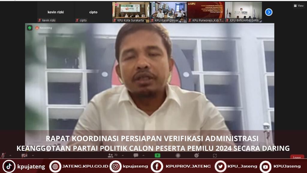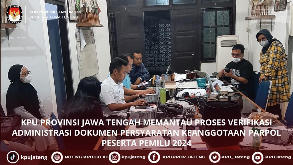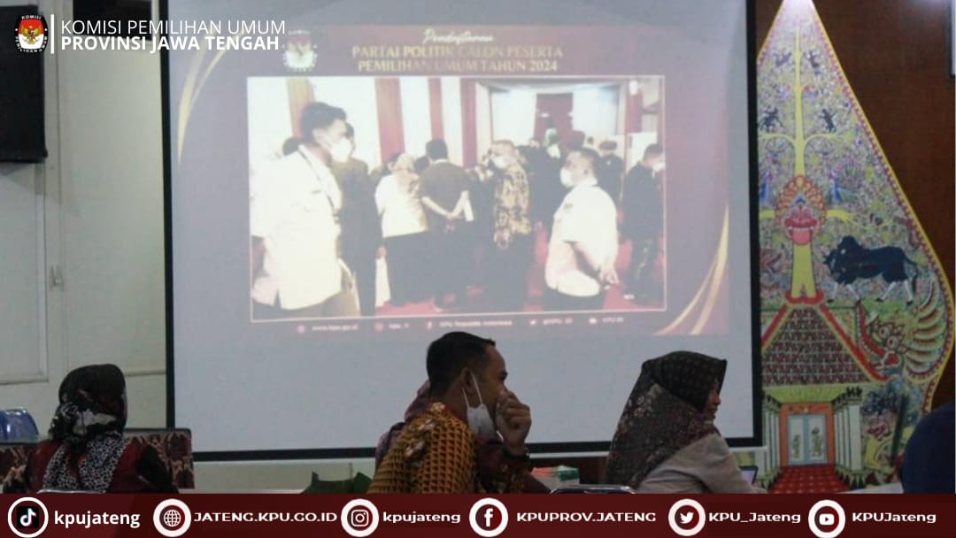 KPU Provinsi Jawa Tengah melakukan kunjungan kerja ke kantor KPU Kab/Kota pada hari Senin s.d Selasa 22 - 23 Agustus 2022. Kunjungan ini dalam rangka memantau proses verifikasi administrasi dokumen persyaratan keanggotaan parpol peserta pemilu 2024 di Jawa Tengah.