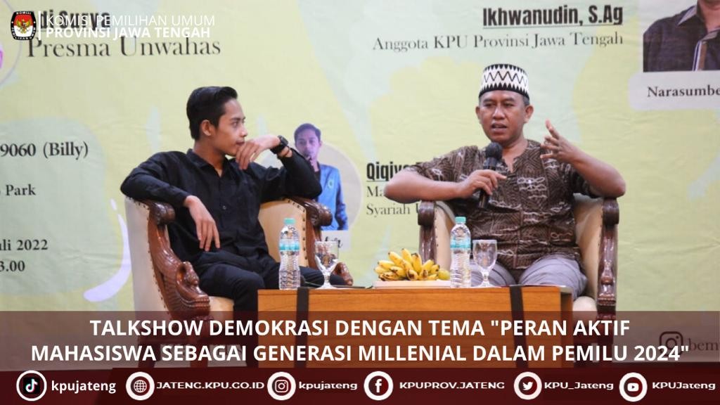Semarang (27/07) Ketua Div. Perencanaan dan Logistik KPU Provinsi Jawa Tengah, Ikhwanuddin hadir sebagai narasumber dalam kegiatan Talkshow Demokrasi dengan tema “Peran Aktif Mahasiswa Sebagai Generasi Millenial Dalam Pemilu 2024” yang diselenggarakan oleh BEM Universitas Wahid Hasyim Semarang di Hotel Metro Park Semarang. Ikhwanuddin menyampaikan materi seputar tahapan penyelenggaraan pemilu 2024, Kompleksitas Penyelenggaraan Pemilu Serentak 2024 dari sisi Penyelenggaraaan, sisi Pemutakhiran Data Pemilih, sisi Logisik, sisi Anggaran, sisi Badan Ad hoc, dan sisi Sarana dan Prasarana. Selain itu Ikhwan juga menjelaskan terkait isu-isu strategis apa yang muncul saat pelaksanaan tahapan pemilu 2024 dan bentuk strategi sosialisasi dan program pendidikan pemilih. Ikhwan juga menjelaskan strategi- strategi dalam meningkatkan partisipasi pemilih diantaranya memperkuat kerjasama antar lembaga dan instansi, memperkuat penggunaan teknologi informasi, menyusun strategi dan rangkaian agenda sosialisasi pemilu dan pemilihan kepada masyarakat, mengoptimalkan kapasitas dan manajemen SDM, serta mengoptimalkan anggaran di setiap program sosialisasi, pendidikan pemilih, dan partisipasi masyarakat. Ikhwanuddin mengapresiasi adanya kegiatan ini dan berharap dengan adanya kegiatan talkshow ini dapat menambah wawasan dan pemahaman pemilih tentang pemilu.