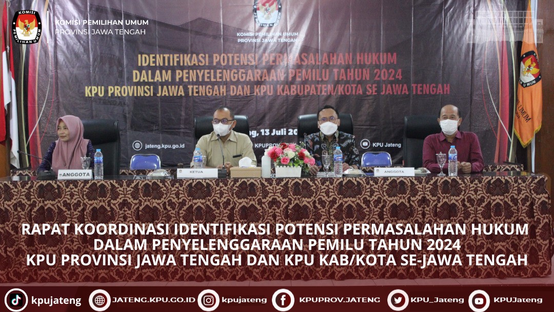 Semarang, (13/07/22) KPU Provinsi menyelenggarakan kegiatan Rapat Koordinasi Identifikasi Potensi Permasalahan Hukum Dalam Penyelenggaraan Pemilu Serentak Tahun 2024. Kegiatan ini melibatkan Polda Jawa Tengah, Kejaksaan Tinggi Jawa Tengah, Sekretariat Daerah Jawa Tengah, Badan Kesbangpol Jawa Tengah, dan Kanwil Kemenkumham Provinsi Jawa Tengah, serta diikuti oleh peserta dari KPU Kab/Kota Se- Jawa Tengah.