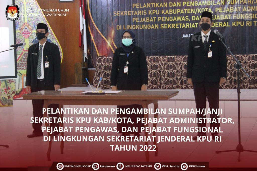 Semarang, (08/07/22) Sekretaris Jenderal KPU Republik Indonesia melantik Pejabat Administrator (Eselon III) dan Pejabat Pengawas (Eselon IV) di lingkungan Sekretariat Jenderal KPU Republik Indonesia, Sekretariat KPU Provinsi/KIP Aceh, dan Sekretariat KPU/KIP Kabupaten/Kota secara luring dan daring.