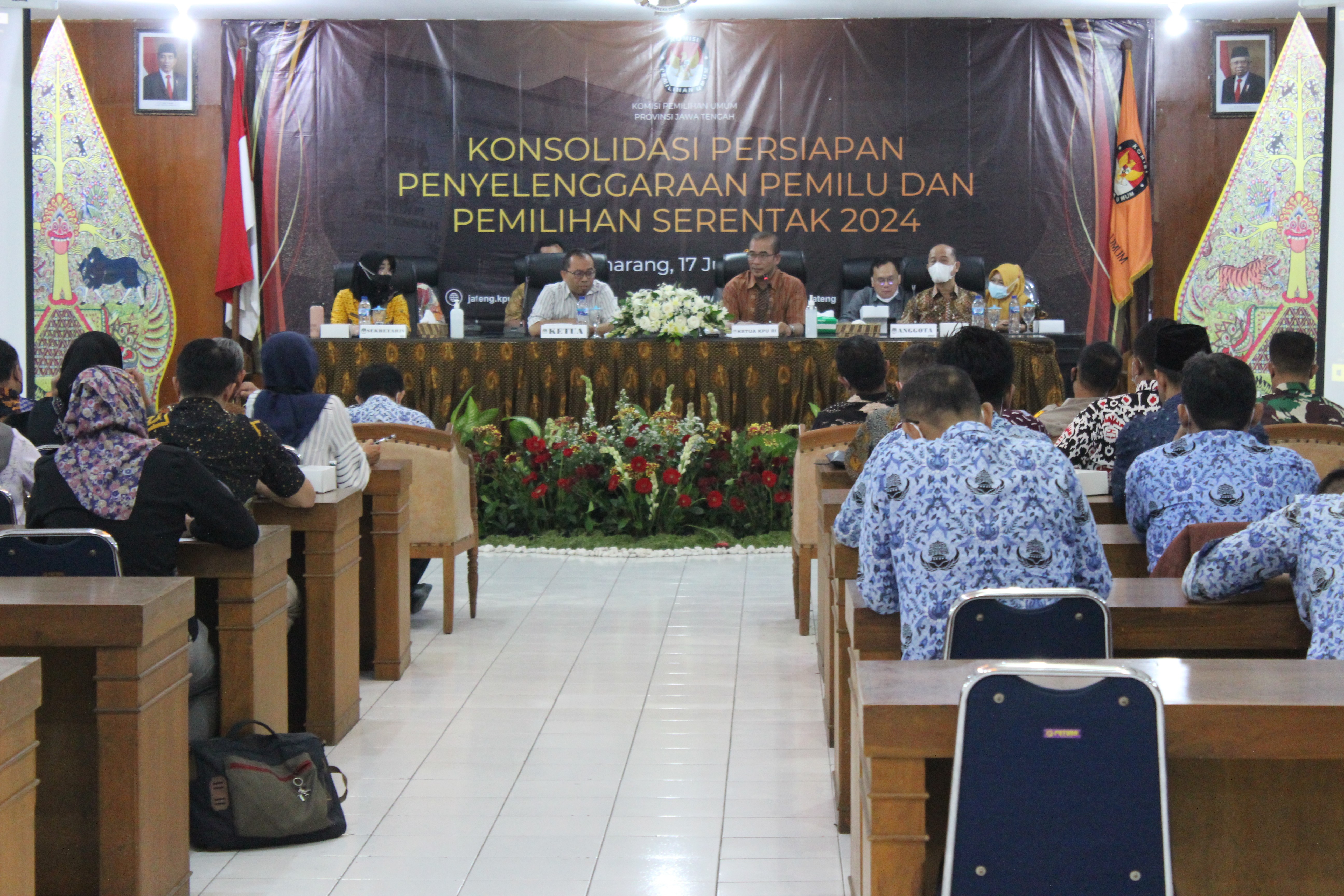 Semarang (17/06) KPU Provinsi Jawa Tengah menyelenggarakan Rapat Konsolidasi Persiapan Pelaksanaan Pemilu dan Pemilihan Serentak 2024 yang dihadiri oleh Ketua KPU RI Hasyim Asy’ari, Pemangku Kepentingan, serta Pimpinan Daerah di Jawa Tengah, antara lain Gubernur,Ketua DPRD, Kapolda, Pangdam, Kepala Kejaksaan Tinggi, Kepala Pengadilan Tinggi, serta Komisioner Bawaslu Provinsi Jawa Tengah.