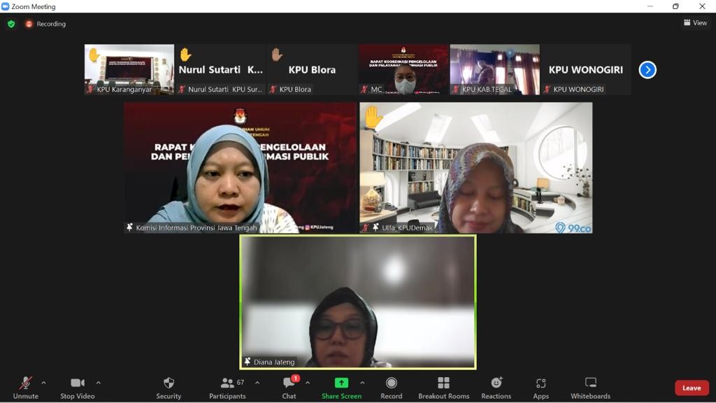 Jum’at (03/06), KPU Provinsi Jawa Tengah menyelenggarakan kegiatan Rapat Koordinasi Pengelolaan dan Pelayanan Informasi Publik melalui Website Resmi Satuan Kerja. Kegiatan ini diikuti oleh 35 satker KPU Kab/Kota secara daring. Kegiatan dibuka oleh Paulus Widiyantoro, Ketua KPU Provinsi Jawa Tengah. Paul menyampaikan kegiatan ini merupakan inisiatif dari Divisi Sosdiklihparmas untuk berkoordinasi dengan KPU Kab/Kota agar website resmi Lembaga dapat meningkat dari sisi kualitas dan pelayanan. Website merupakan wajah dari KPU,sehingga penting membuat wajah KPU menjadi ramah dan diminati masyarakat. Diana Ariyanti, Ketua Divisi Sosdiklihparmas yang hadir sebagai Pemantik Diskusi juga menyampaikan bahwa KPU sebagai Lembaga Publik adalah Lembaga yang bisa memberikan informasi yang komprehensif kepada publik. Dalam rakor ini, kedepan KPU harus memberikan pelayanan yang lebih baik dengan memberi informasi komprehensif, cepat, dan akurat . Narasumber dalam kegiatan ini, Ermy Sri Ardhyanti, Komisi Bidang Kelembagaan Komisi Informasi Provinsi Jawa Tengah memaparkan materi terkait Layanan Informasi Publik KPU Kabupaten/Kota se- Jawa Tengah diantaranya tentang kondisi pelayanan informasi publik di seluruh Satker KPU se- Jawa Tengah, jenis informasi publik, hingga hal yang perlu disiapkan dalam menghadapi Monitoring Evaluasi dan Pemeringkatan Badan Publik 2022 dari Komisi Informasi Provinsi Jawa Tengah.