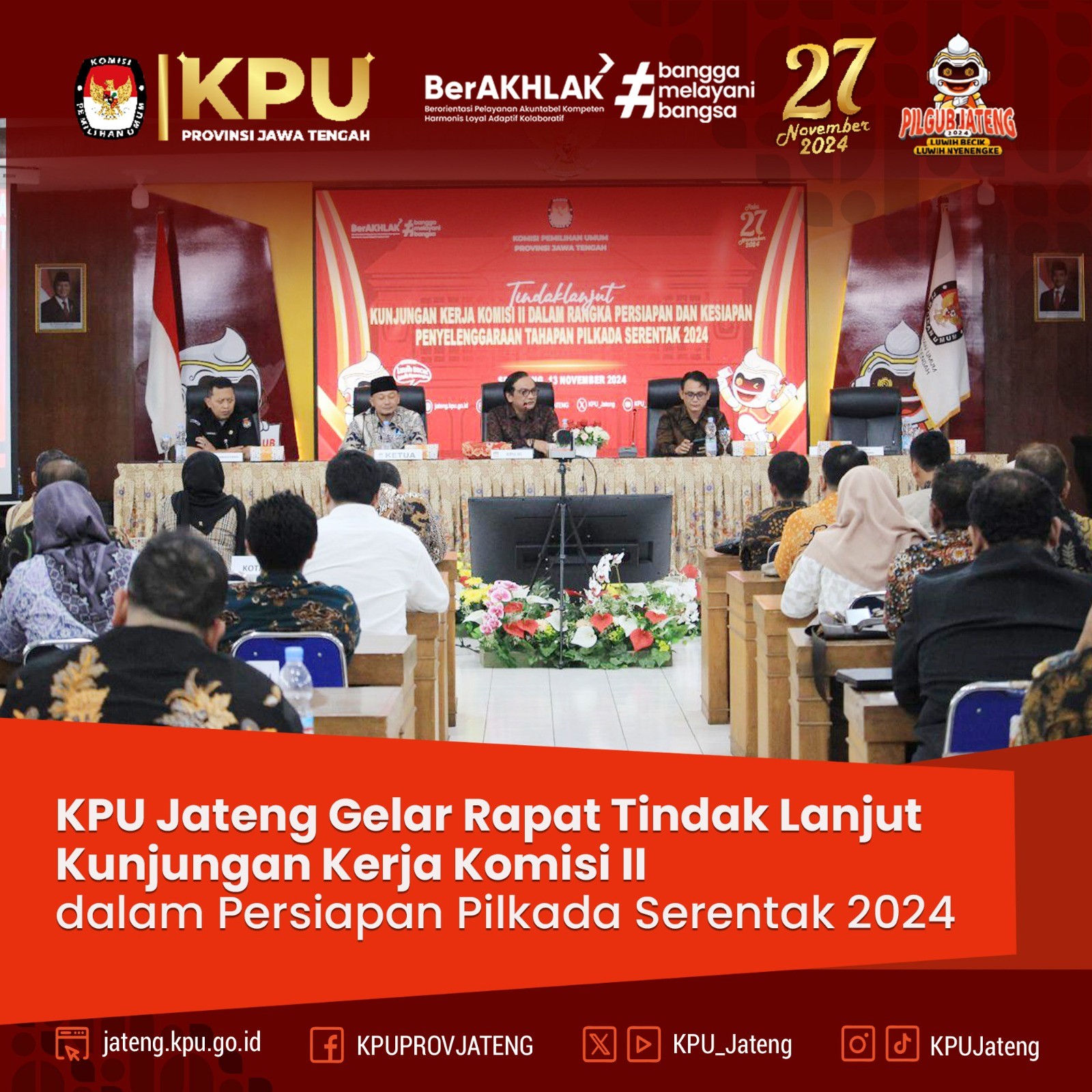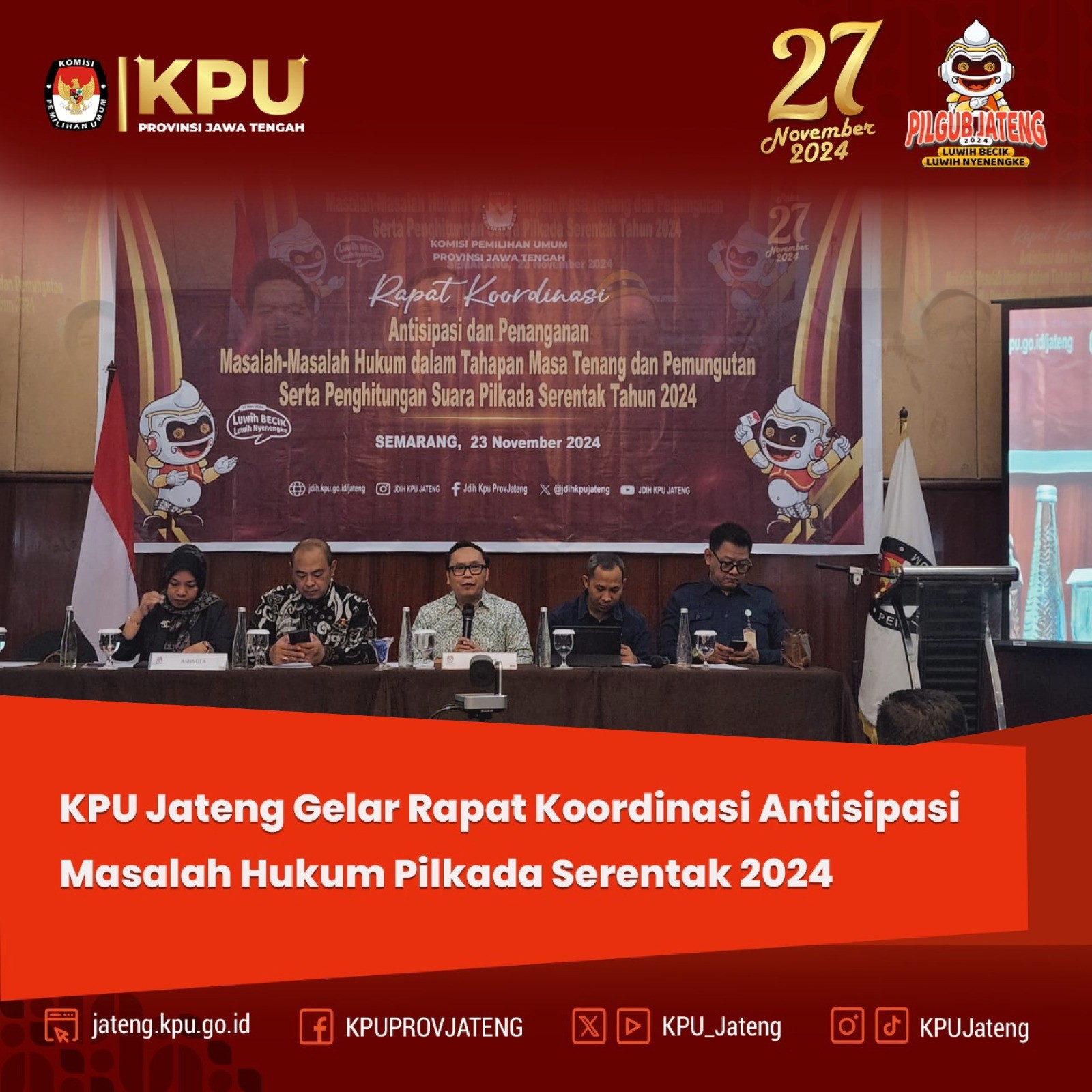 SEMARANG -- Komisi Pemilihan Umum (KPU) Provinsi Jawa Tengah menyelenggarakan Rapat Koordinasi Antisipasi dan Penanganan Masalah-Masalah Hukum dalam Tahapan Masa Tenang dan Pemungutan serta Penghitungan Suara Pilkada Serentak Tahun 2024 di Novotel Kota Semarang, Sabtu (23/11/2024).