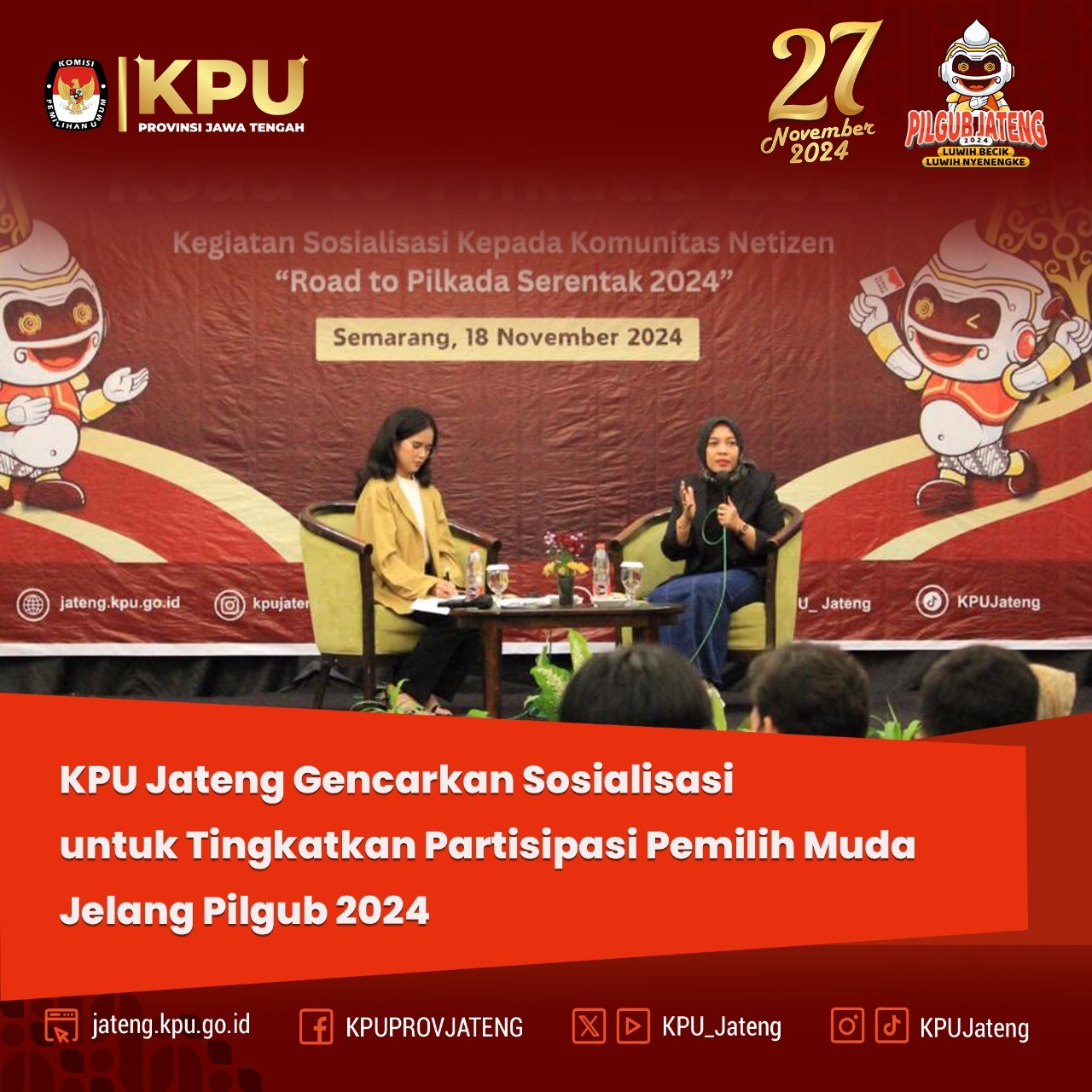 Kegiatan ini dihadiri oleh Jajaran Forum Koordinasi Pimpinan Daerah (Forkopimda) Jawa Tengah, instansi terkait, tim kampanye pasangan calon (Paslon), lembaga survei atau hitung cepat, serta Kadiv Hukum dan Pengawasan dan Kasubbag TPP dan Hukum KPU Kabupaten/Kota se-Jawa Tengah.