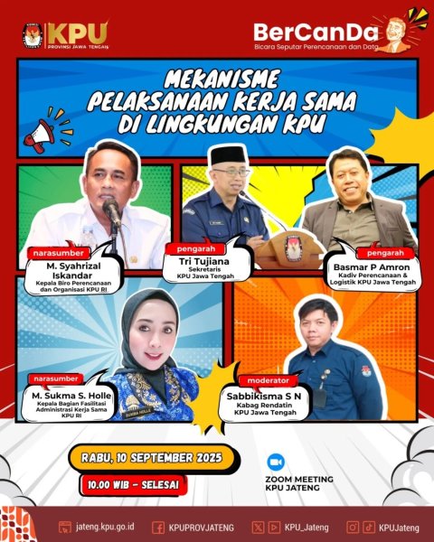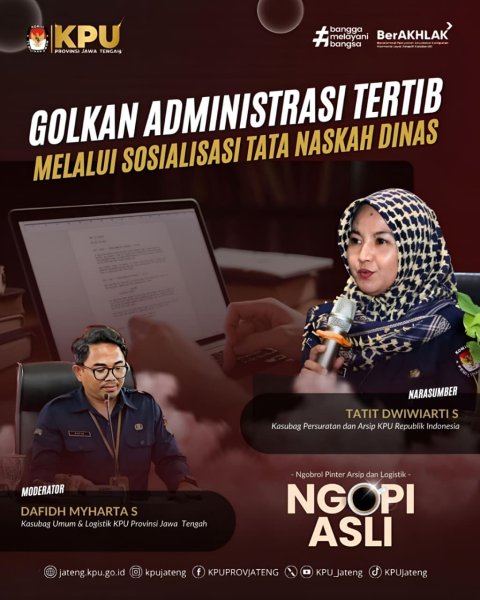 Semarang, 19 Agustus 2025 — Komisi Pemilihan Umum (KPU) Provinsi Jawa Tengah kembali menggelar forum diskusi mingguan Ngopi Asli (Ngobrol Pinter Arsip dan Logistik) secara daring. Pada edisi kali ini, tema yang diangkat adalah “Golkan Administrasi Tertib Melalui Sosialisasi Tata Naskah Dinas.”
