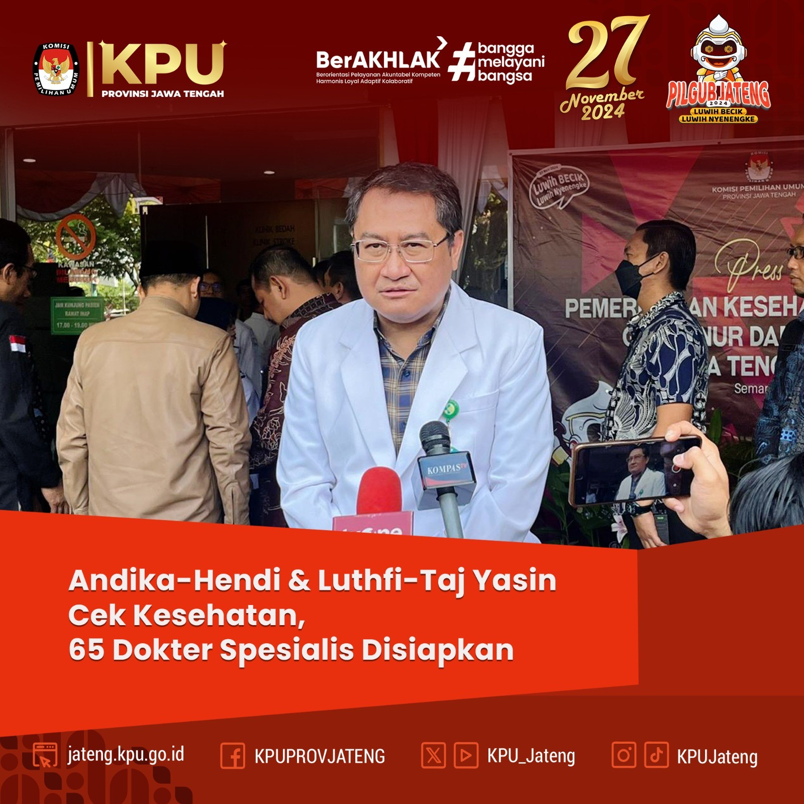 Pemeriksaan ini melibatkan 65 dokter spesialis konsultan yang siap memeriksa kesehatan fisik, mental, dan melakukan tes narkotika sebagai bagian dari tahapan pendaftaran Pilgub Jateng 2024.