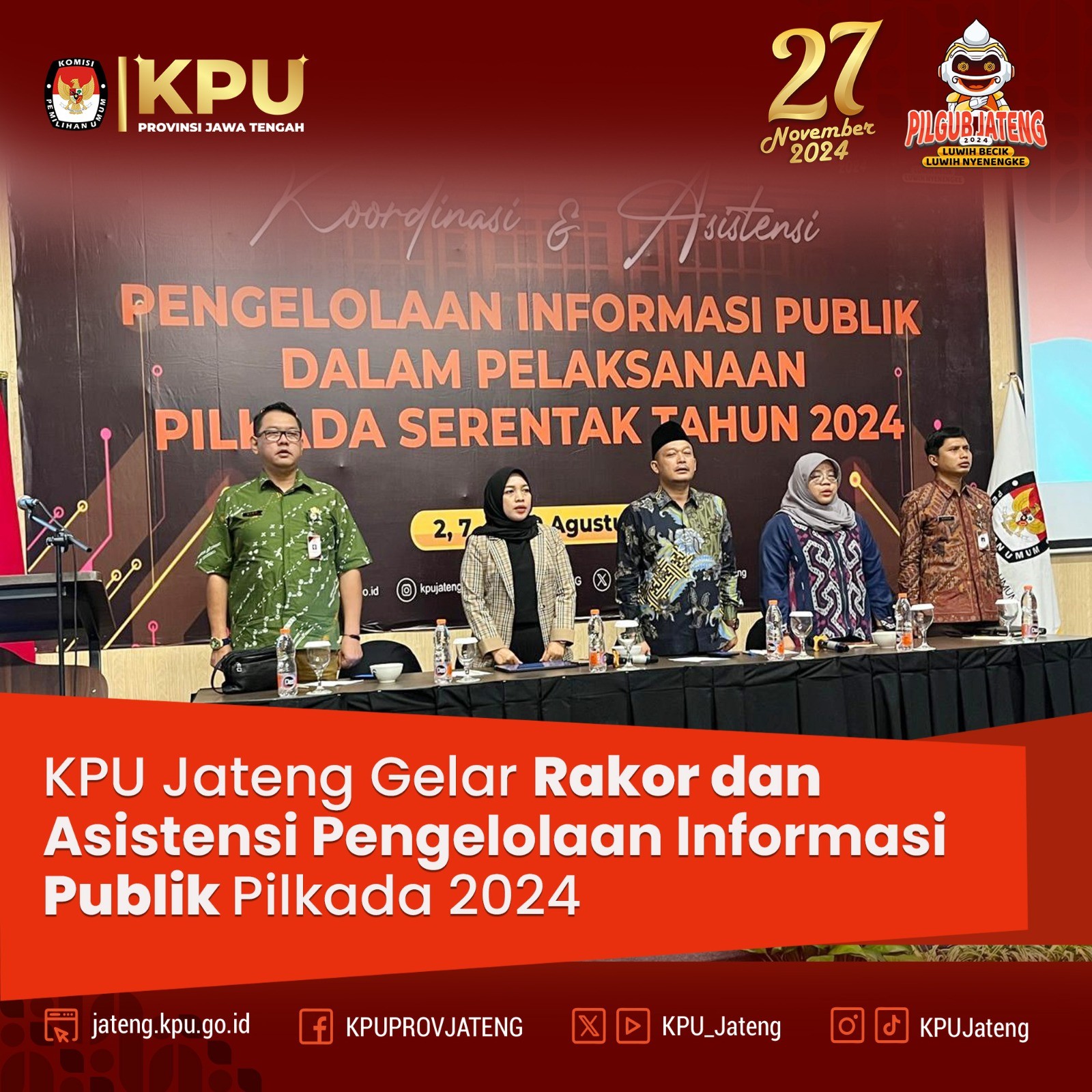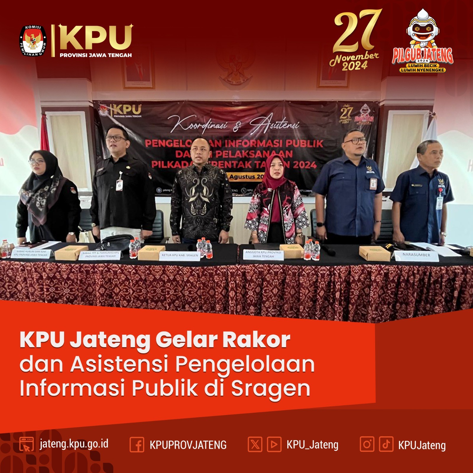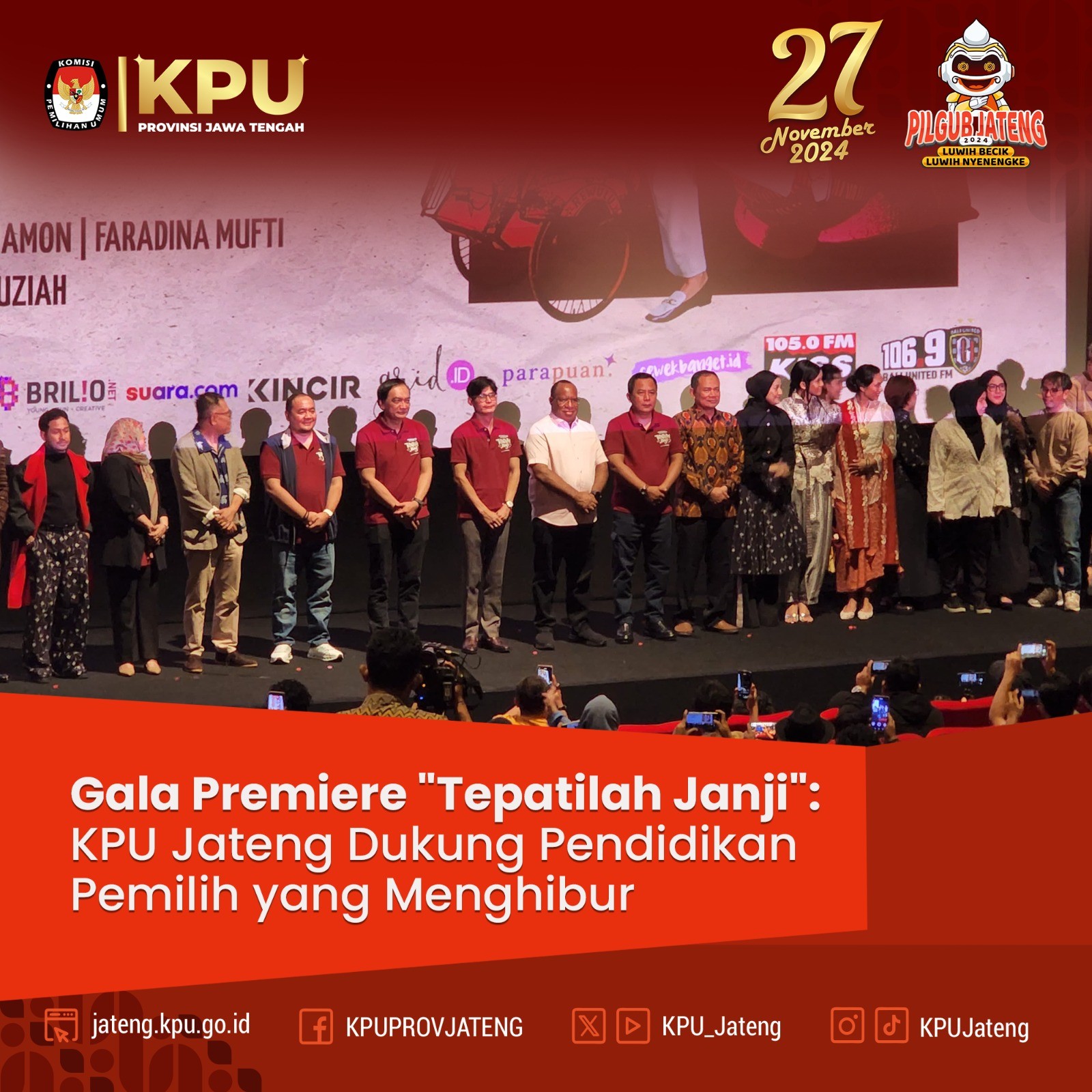 JAKARTA -- Kadiv Sosdiklihparmas KPU Jateng, Akmaliyah dan Sekretaris KPU Jateng, Arief Suja’i, menghadiri Gala Premiere film Pilkada "Tepatilah Janji" di Studio XXI Epicentrum, Jakarta Selatan, Jumat (9/8/2024). Acara ini diselenggarakan oleh KPU RI untuk memperkenalkan film yang mengedukasi dan menghibur. Ketua KPU RI, Mochammad Afiffudin, dalam sambutannya menekankan bahwa film ini merupakan bagian dari upaya KPU untuk mensosialisasikan pemilu dan Pilkada kepada masyarakat. "Kami ingin pemilu dan Pilkada tahun ini disambut dengan antusiasme. Film ini adalah salah satu cara kami untuk menyampaikan pesan sosialisasi, dan kami butuh dukungan Anda semua," ujar Afiffudin. Film "Tepatilah Janji" adalah sekuel dari "Kejarlah Janji," melanjutkan kisah keluarga Pertiwi. Dalam film ini, Adam, seorang kepala desa, terjun ke dunia politik pilkada yang penuh kompetisi dan kompleksitas tanpa etika. Konflik muncul di tengah keluarganya, melibatkan istrinya Tari dan adik-adiknya, Sekar dan Isham. Cerita juga menyentuh kisah cinta antara Pak Janji dan Ibu Pertiwi yang menjanda, menambah drama film ini. "Tepatilah Janji" menghadirkan tantangan etika dan proses kepemimpinan dalam menghadapi pilkada yang semakin dekat. Gala premiere ini diharapkan dapat meningkatkan kesadaran masyarakat tentang pentingnya etika dan proses yang baik dalam pemilihan kepala daerah, sekaligus memperkuat pendidikan pemilih melalui media film.