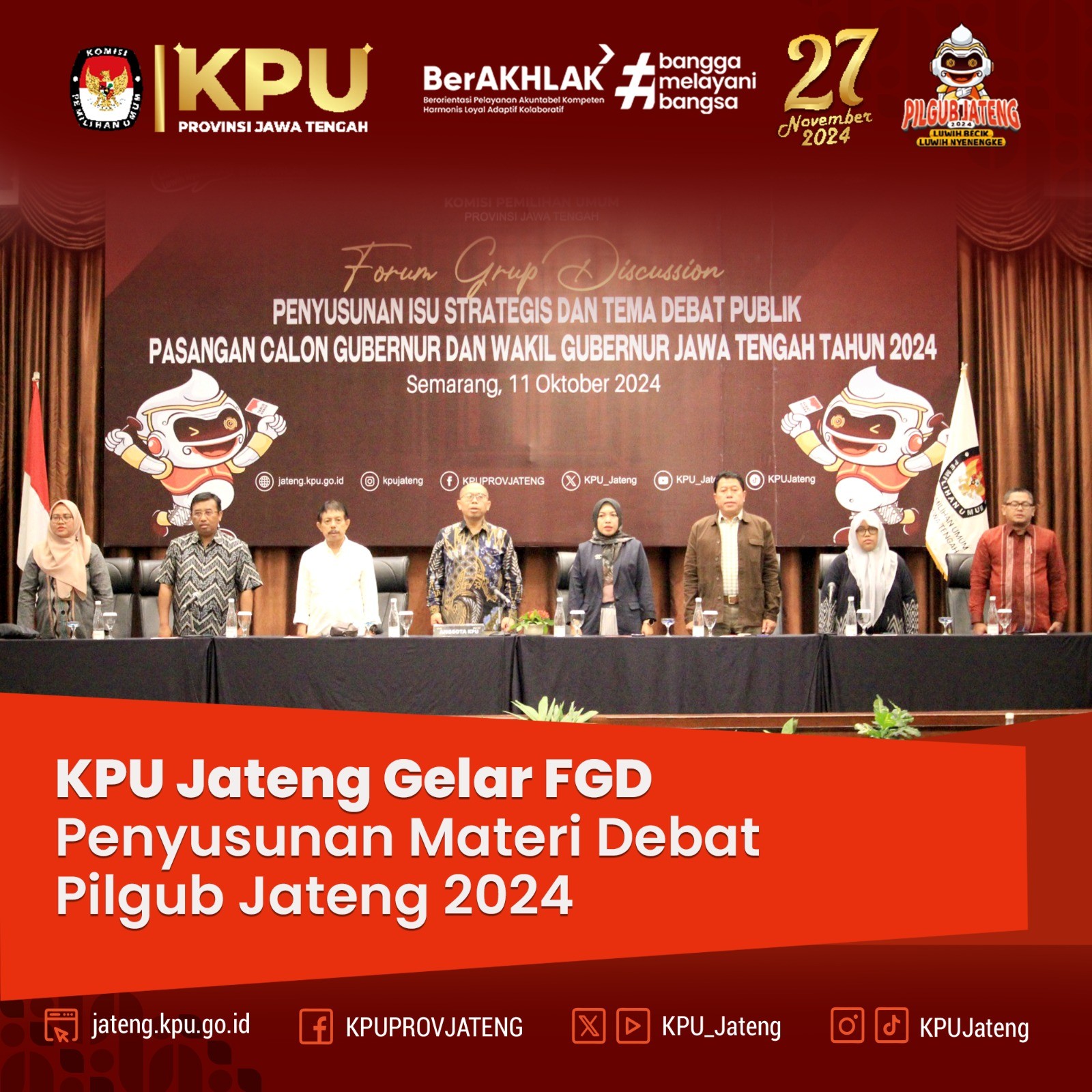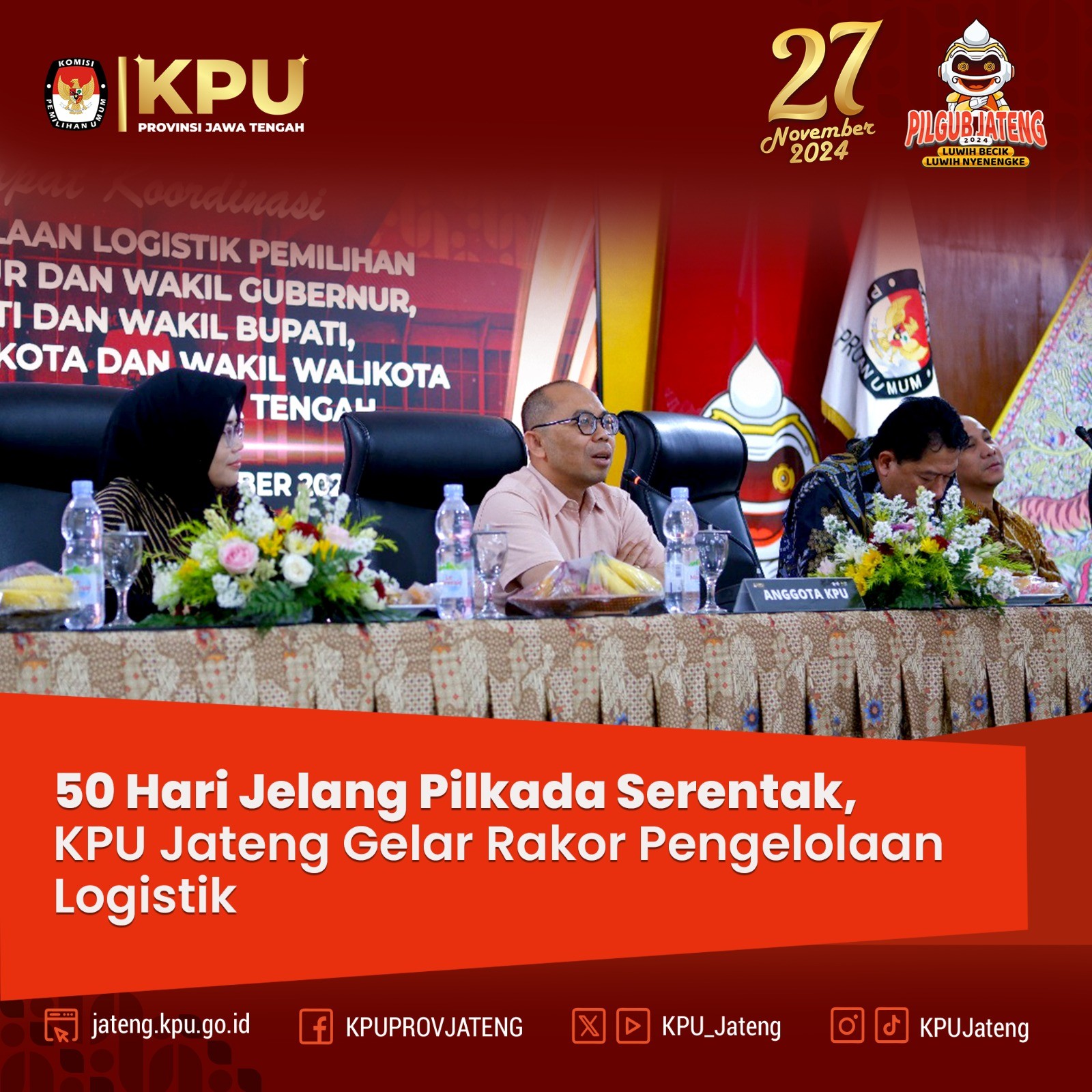 SEMARANG– KPU Jateng menggelar Rapat Koordinasi Pengelolaan Logistik Pemilihan Gubernur dan Wakil Gubernur, Bupati dan Wakil Bupati, Walikota dan Wakil Walikota Tahun 2024. Acara ini berlangsung pada Selasa (8/10/2024) hingga Rabu (9/10/2024) di kantor KPU Jateng dan diikuti oleh Ketua, Sekretaris, Kasubbag KUL dan Operator Silog KPU Kabupaten/Kota se- Jateng serta para pemangku kepentingan lainnya. Pada kesempatan tersebut, Anggota dan Sekretaris KPU Jateng juga hadir dalam rapat koordinasi. Acara ini dibuka oleh Paulus Widiyantoro, yang didampingi oleh Basmar Periyanto Amron, Mey Nurlela, Muslim Aisha dan Muhammad Machruz selaku Anggota KPU Jateng. Dalam sambutannya, Paulus mengingatkan bahwa hari pemungutan suara tinggal 50 hari lagi dan penyediaan logistik Pilkada menjadi perhatian banyak pihak. Selain itu, KPU Jateng harus memiliki prinsip tepat jenis, tepat waktu dan tepat jumlah dalam penyediaan logistik Pilkada ke daerah-daerah di Jateng. Rapat koordinasi ini juga turut menghadirkan narasumber dari Polda Jateng, Kodam IV/Diponegoro, Badan Arsip dan Perpustakaan Jateng, BPBD Jateng, BMKG Jateng dan Biro Logistik KPU RI. Acara ini ditutup oleh Ketua KPU Jateng, Handi Tri Ujiono.