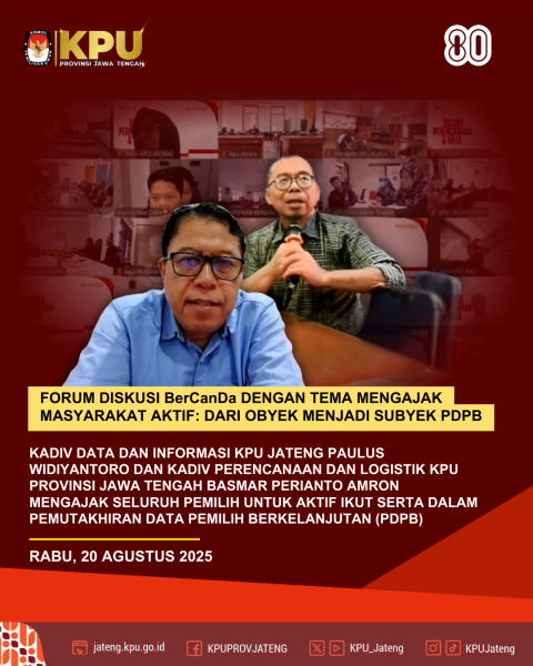 Semarang, 20 Agustus 2025 – Komisi Pemilihan Umum Provinsi Jawa Tengah menggelar forum diskusi rutin "BerCanDa" (Bicara Seputar Perencanaan dan Data) secara daring. Pada edisi kali ini mengangkat tema tentang “Mengajak Masyarakat Aktif : Dari Obyek Menjadi Subyek PDPB” Kegiatan dibuka oleh Anggota KPU Provinsi Jawa Tengah Basmar Perianto Amron, yang menyampaikan bahwa KPU harus mampu mengajak masyarakat agar ikut serta dalam pemutakhiran data pemilih berkelanjutan (PDPB) dan mengajak stakeholder terkait untuk aktif berkoordinasi menghasilkan data pemilih yang mutakhir. Kegiatan ini menghadirkan narasumber Nur Kholis. SE, M.Si, Sekretaris Dinas Pemberdayaan Masyarakat, Desa, Kependudukan dan Pencatatan Sipil Provinsi Jawa Tengah, M. Rikza Hasballa, S.M, Ketua Perisai Demokrasi Bangsa dan Siti Nur Wakhidatun, Anggota KPU Kabupaten Jepara Divisi Perencanaan, Data dan Informasi dengan Moderator Sabbikisma Setia Nugraha, Kepala Bagian Perencanaan, Data dan Informasi KPU Provinsi Jawa Tengah. Dalam paparannya Nur Kholis menyampaikan apresiasi terhadap kerja KPU se-Jawa Tengah karena telah membantu dalam pembaruan data kependudukan yang dilakukan pada pemutakhiran data pemilih. Disdukcapil juga siap membantu untuk penerbitan akta kematian bagi pemilih TMS meninggal dunia. Narasumber kedua, M. Rikza Hasballa, menyampaikan dalam paparannya perlu adanya peran serta masyarakat untuk aktif melaporkan kepada KPU jika ada perubahan data diri serta mendorong KPU rutin dan aktif dalam pembuatan konten-konten yang interaktif dan edukatif untuk menjelaskan pentingnya PDPB. Narasumber terakhir Siti Nur Wakhidatun menyampaikan kerja-kerja yang telah dilakukan KPU Kabupaten Jepara antara lain membuka layanan pelaporan diri melalui media online, berkoordinasi secara aktif ke stakeholder terkait serta melakukan sosialisasi melalui media sosial terkait pelaksanaan PDPB. Senada hal tersebut, Kediv Data dan Informasi Paulus Widiyantoro KPU Jateng menyampaikan dorongan kepada KPU Kabupaten/Kota se-Jawa Tengah untuk berkoordinasi dengan pihak-pihak terkait.