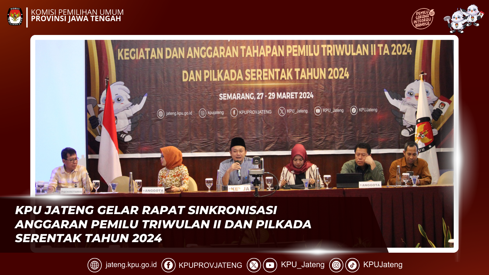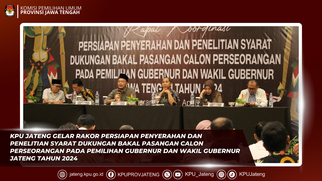 Semarang, 27 April 2024 KPU Provinsi Jawa Tengah secara resmi meluncurkan tahapan Pemilihan Gubernur dan Wakil Gubernur Jawa Tengah Tahun 2024 di Sam Poo Kong, Semarang pada Sabtu, 27 April 2024. Acara tersebut dihadiri oleh berbagai pihak terkait, seperti KPU RI, Pj Gubernur Jawa Tengah, Jajaran Forkopimda, Bawaslu Jawa Tengah,KPU Kabupaten/Kota se Jawa Tengah, partai politik, perguruan tinggi, tokoh masyarakat, organisasi kemasyarakatan, dan organisasi keagamaan. Dalam acara tersebut, KPU Provinsi Jawa Tengah memperkenalkan maskot dan jingle resmi untuk Pemilihan Gubernur dan Wakil Gubernur Jawa Tengah Tahun 2024, serta menayangkan iklan layanan masyarakat (ILM) untuk Pemilihan Gubernur dan Wakil Gubernur Jawa Tengah Tahun 2024. Maskot yang dipilih adalah Semar Ki Lurah Badranaya, tokoh pewayangan punakawan yang memiliki sifat adil, jujur, tulus, bijaksana, cerdas, dan berpengetahuan luas. Ekspresi bahagia pada wajah Semar melambangkan ramah dan keberadaannya yang ikonik serta dihormati oleh masyarakat Jawa. Pemilihan Semar sebagai maskot Pilgub Jawa Tengah 2024 dilakukan setelah melakukan diskusi dengan instansi terkait, budayawan, dan seniman untuk mendesain logo pilgub dan memberikan masukan terkait pilihan maskot. Maskot Semar Ki Lurah Badranaya diubah dengan bentuk yang lebih futuristik untuk mencerminkan citra KPU Jateng yang kekinian dalam pemanfaatan Teknologi Informasi dalam penyelenggaraan Pemilihan Gubernur Jateng 2024. Tagline atau slogan yang dipilih untuk Pilgub Jateng 2024 adalah “Luwih Becik Luwih Nyenengke”, yang menggambarkan harapan agar pelaksanaan pilgub dapat berjalan lebih baik dan membuat semua pihak yang terlibat merasa senang bagi warga Jawa Tengah. Acara ini juga dimeriahkan dengan penampilan Tari Lentera Jawa serta hiburan dari artis Pongki Barata dan Kiki Juliar OVJ. Dalam sambutannya, Ketua KPU Provinsi Jawa Tengah, Handi Tri Ujiono, menyampaikan bahwa peluncuran ini bertujuan untuk memperkenalkan maskot dan jingle Pemilihan Gubernur Jawa Tengah Tahun 2024, yang menggambarkan Semar sebagai sosok yang arif, bijaksana, dan tanggap terhadap perubahan zaman. Sementara itu, Pj Gubernur Jawa Tengah, Drs. Nana Sudjana, menyatakan bahwa kolaborasi adalah kunci kesuksesan dalam pilkada serentak tahun 2024 ini serta menekankan pentingnya menjaga netralitas dan memberikan pelayanan secara profesional kepada para kontestan. Ketua KPU RI, Hasyim Asy'ari yang hadir bersama Anggota, Yulianto Sudrajat berterima kasih kepada Pemprov Jateng atas dukungan anggaran yang diberikan untuk melaksanakan Pemilihan Gubernur dan Wakil Gubernur Jawa Tengah tahun 2024. Hasyim berharap pelaksanaan Pilkada di Jawa Tengah berjalan sukses, lancar, dan aman, serta dapat meningkatkan partisipasi masyarakat dalam demokrasi. Acara Peluncuran Pemilihan Gubernur dan Wakil Gubernur Jawa Tengah Tahun 2024 ini dapat ditonton oleh masyarakat di kanal youtube KPU Jateng.