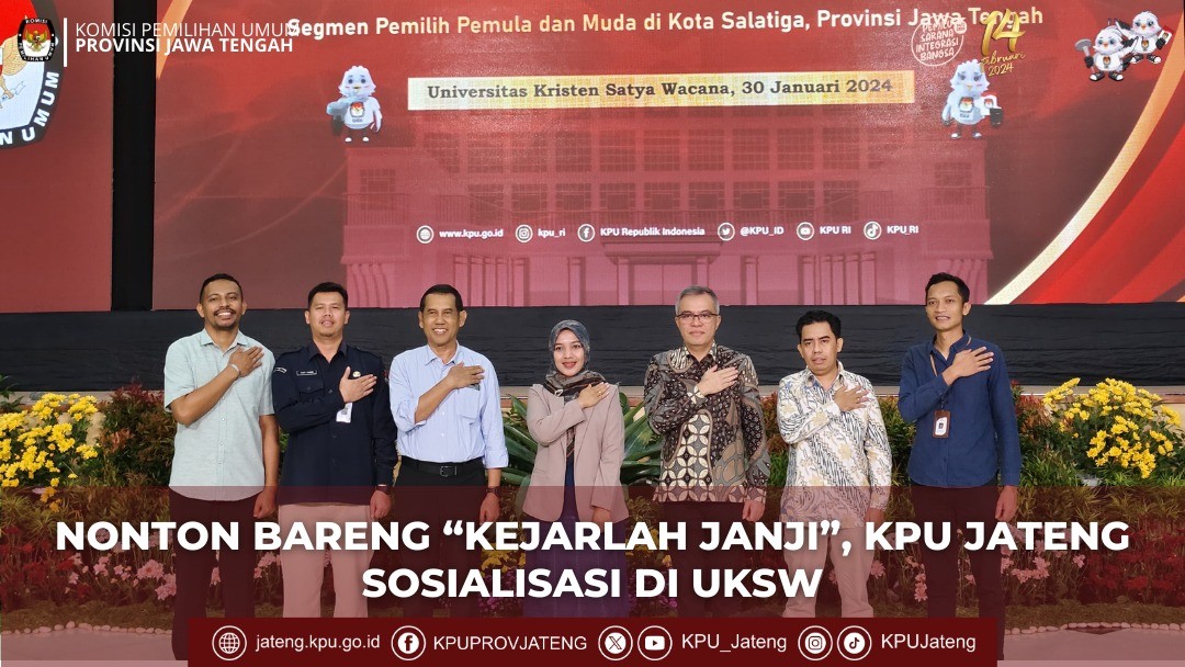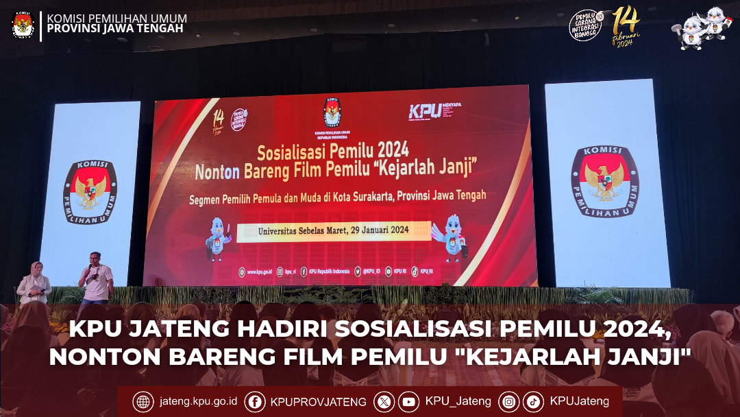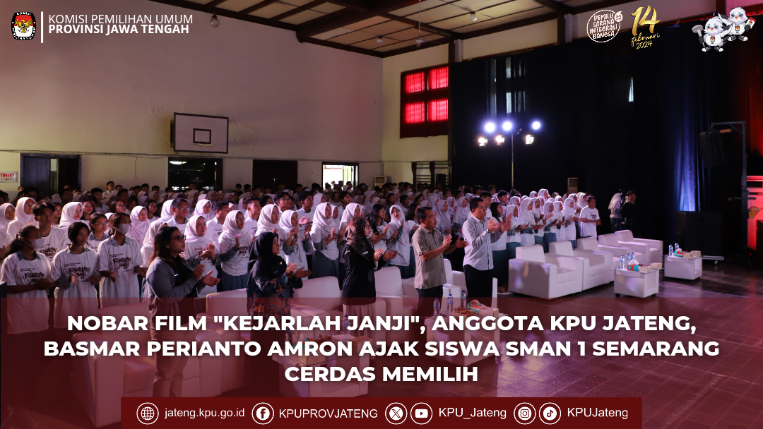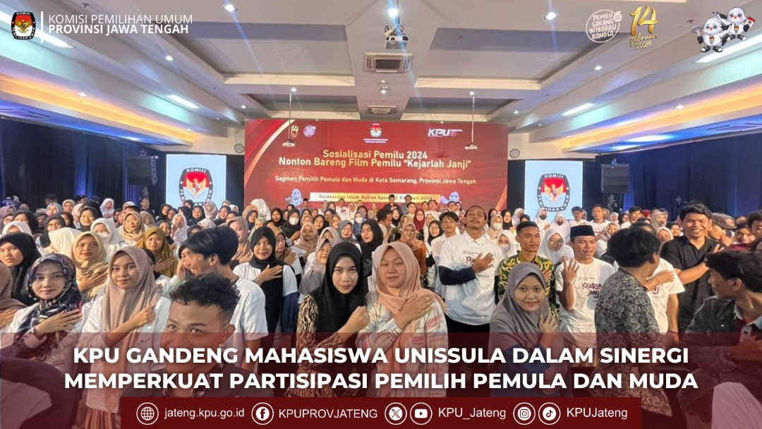 Semarang, 1 Februari 2024-KPU Provinsi Jawa Tengah aktif dalam rangka meningkatkan partisipasi masyarakat pada Pemilu Serentak 2024. Dalam upaya tersebut, KPU Jateng menghadiri kegiatan Sosialisasi Pemilu 2024 dengan menggelar Nonton Bareng Film "Kejarlah Janji" di Universitas Islam Sultan Agung (UNISSULA) Semarang pada Kamis, 1 Februari 2024. Acara tersebut diselenggarakan oleh KPU Republik Indonesia dan dihadiri oleh 400 mahasiswa/i dari berbagai fakultas UNISSULA Semarang. Kegiatan bertujuan untuk memperkuat hubungan antar lembaga pemerintah, non-pemerintah, dan lembaga kemasyarakatan, serta mendorong partisipasi aktif pemilih muda dan pemilih pemula pada Pemilu Serentak 2024.Anggota KPU Provinsi Jawa Tengah, Kadiv. Sosdiklihparmas, Akmaliyah, turut hadir dalam acara tersebut. Dalam sambutannya, Akmaliyah menjelaskan bahwa kegiatan ini merupakan salah satu strategi KPU untuk meningkatkan partisipasi masyarakat, khususnya pemilih usia millenial dan gen-z yang mencapai 52,88% di Jawa Tengah. Akmaliyah berharap bahwa melalui film "Kejarlah Janji", para pemilih, terutama generasi muda, dapat mengubah paradigma berpikirnya. "Film ini diharapkan mampu memberikan pelajaran berharga kepada pemilih muda dan pemula sebagai generasi penerus bangsa," ucapnya.Selain itu, Akmaliyah mengajak seluruh pemilih untuk menggunakan hak pilihnya dengan bijak dan menolak politik uang secara tegas. "Partisipasi aktif dan pilihan bijak kita akan membentuk masa depan demokrasi Indonesia," tandasnya. Kegiatan ini menjadi langkah konstruktif dalam menciptakan sinergitas dan kolaborasi antarlembaga serta membangun kesadaran pemilih akan pentingnya peran mereka dalam menentukan arah bangsa melalui Pemilu Serentak 2024.