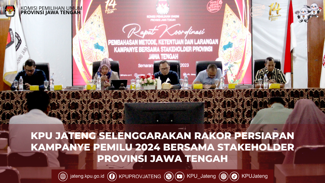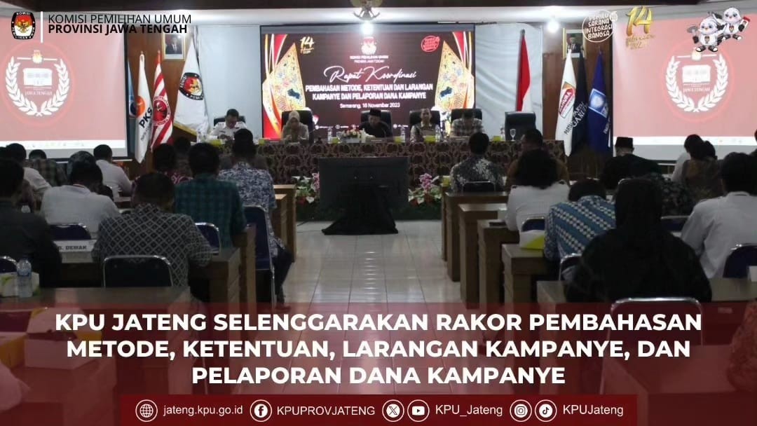 #TemanPemilih Semarang (16/11) KPU Provinsi Jawa Tengah menggelar Rapat Koordinasi Pembahasan Metode, Ketentuan, Larangan Kampanye, dan Pelaporan Dana Kampanye di Aula Lt. 3 Kantor KPU Provinsi Jawa Tengah. Ketua KPU Provinsi Jawa Tengah, Handi Tri Ujiono, memimpin rapat ini bersama anggota KPU lainnya, yakni Basmar Perianto Amron, Muhammad Machruz, Akmaliyah, dan Muslim Aisha. Kegiatan ini diikuti oleh Kadiv. Teknis dan Operator SIKADEKA 35 satker KPU Kab/Kota. Bawaslu Jawa Tengah turut serta dalam kegiatan ini sebagai bentuk dukungan terhadap penyelenggaraan pemilu yang bersih dan adil. Ketua KPU Provinsi Jawa Tengah, Handi Tri Ujiono, dalam sambutannya mengungkapkan bahwa hari ini tepat H-89 menuju Pemilu 2024, dan KPU tengah fokus pada pengadaan perangkat terkait kontestasi pemilu tersebut, salah satunya pengadaan surat suara. Menjelang penyelenggaraan tahapan kampanye pada tanggal 28 November mendatang, Handi Tri Ujiono menegaskan pentingnya persiapan yang matang. Handi menyoroti aspek pengaturan domain pelaksanaan kampanye dan pembahasan pelaporan dana kampanye. Handi menekankan perlunya pertanggungjawaban yang baik dalam penggunaan dana kampanye sesuai dengan Undang-Undang. "Seluruh aktivitas penggunaan dana kampanye menurut Undang-Undang harus dipertanggungjawabkan dengan baik. Terkait pelaporan dana kampanye, kita harus memperlakukan peserta pemilu dengan adil dan setara," kata Handi Tri Ujiono. Handi juga meminta agar KPU Kabupaten/Kota berkoordinasi dengan peserta pemilu untuk memastikan proses kampanye dan pendanaannya dapat terlaksana. Kadiv. Hukum dan Pengawasan, Muslim Aisha, memberikan arahan terkait menjaga kredibilitas dan ketertiban dalam pelaksanaan tahapan pemilu selanjutnya. Muslim menekankan bahwa potensi pelanggaran pemilu banyak terjadi pada tahapan kampanye dan dana kampanye. Dengan demikian, peserta diharapkan memanfaatkan forum ini secara maksimal untuk menghindari potensi sengketa. Kadiv. Perencanaan dan Logistik, Basmar Perianto Amron, menambahkan agar KPU Kabupaten/Kota segera berkoordinasi secara intens dengan Bupati maupun Walikota terkait SK Pemasangan Alat Peraga Kampanye. Hal ini diharapkan dapat memastikan persiapan pelaksanaan kampanye agar bisa segera dilakukan. Kegiatan Rapat Koordinasi ini dipandu oleh Kabag TPP dan Parhumas, Dewantoputra Adhipermana. Sebelum memasuki sesi pembahasan materi, peserta diminta untuk melakukan pretest terlebih dahulu. Sesi pertama diisi oleh Kadiv. Teknis Penyelenggaraan Pemilu, Muhammad Machruz, yang mengkaji Peraturan KPU Nomor 18 Tahun 2023 tentang Dana Kampanye Pemilu 2024 dan Keputusan KPU Nomor 1190 Tahun 2023 tentang Pedoman Teknis Pembukaan dan Penutupan Rekening Khusus Dana Kampanye. Machruz menyoroti pentingnya laporan proses penyusunan RKDK secara berjenjang untuk memberikan gambaran utuh kepada KPU Provinsi dalam persiapan pelaksanaan tahapan pemilu 2024. Sesi kedua membahas Peraturan KPU Nomor 15 Tahun 2023 dan Peraturan KPU Nomor 20 Tahun 2023 mengenai Kampanye Pemilu 2024 serta Keputusan KPU Nomor 1621 Tahun 2023 tentang Pedoman Teknis Pelaksanaan Kampanye Pemilihan Umum oleh Kadiv. Sosdiklihparmas, Akmaliyah. Akmaliyah menekankan perlunya mengantisipasi dan memitigasi peserta pemilu untuk tidak melakukan kampanye di luar waktu yang ditentukan. Akmaliyah juga mendorong KPU Kabupaten/Kota untuk membuat Iklan Layanan Masyarakat agar sosialisasi pemilu 2024 dapat terselenggara lebih masif melalui media radio dan televisi. Kegiatan ditutup dengan roleplay penggunaan aplikasi SIKADEKA yang dipandu oleh Kasubbag Teknis Penyelenggaraan Pemilu, Dimas D. Narottama.