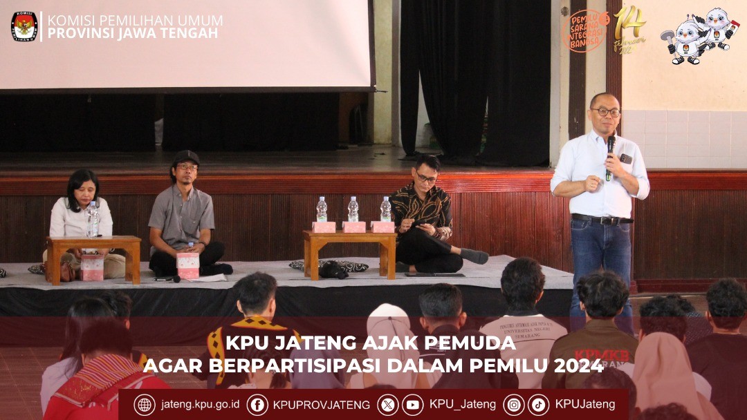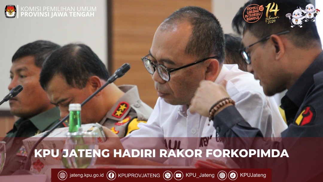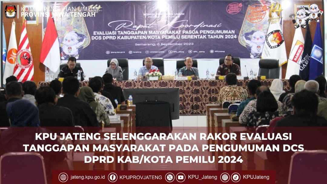 (6/9) KPU Provinsi Jawa Tengah menyelenggarakan Rapat Koordinasi Evaluasi Tanggapan Masyarakat Pasca Pengumuman DCS DPRD Kabupaten/Kota se-Jawa Tengah pada Pemilu Serentak Tahun 2024. Kegiatan yang berlangsung di Aula Lantai 3 Kantor KPU Provinsi Jawa Tengah pada hari Rabu tanggal 6 September 2023 ini dihadiri oleh Ketua KPU Kab/Kota, Anggota KPU Kab/Kota Divisi Teknis Penyelenggaraan Pemilu, dan Kasubbag TPP Parhumas Sekretariat KPU Kab/Kota se-Jawa Tengah. Ketua KPU Provinsi Jawa Tengah, Paulus Widiyantoro berkesempatan membuka acara didampingi oleh anggota KPU Jateng antara lain, Putnawati, M. Taufiqurrohman dan Henry Wahyono. Dalam sambutannya, Paulus menyampaikan apresiasi kepada KPU Kabupaten/Kota karena tidak ada sengketa proses atas DCS yang diumumkan. Paulus menghimbau kepada KPU Kabupaten/Kota untuk selalu cermat dalam melaksanakan seluruh tahapan Pemilu 2024. Kemudian, kegiatan dilanjutkan dengan pemaparan materi tentang evaluasi tanggapan masyarakat pasca pengumuman DCS DPRD Kab/Kota Pemilu 2024 oleh Putnawati Kadiv. Teknis Penyelenggaraan Pemilu KPU Provinsi Jawa Tengah.