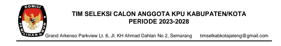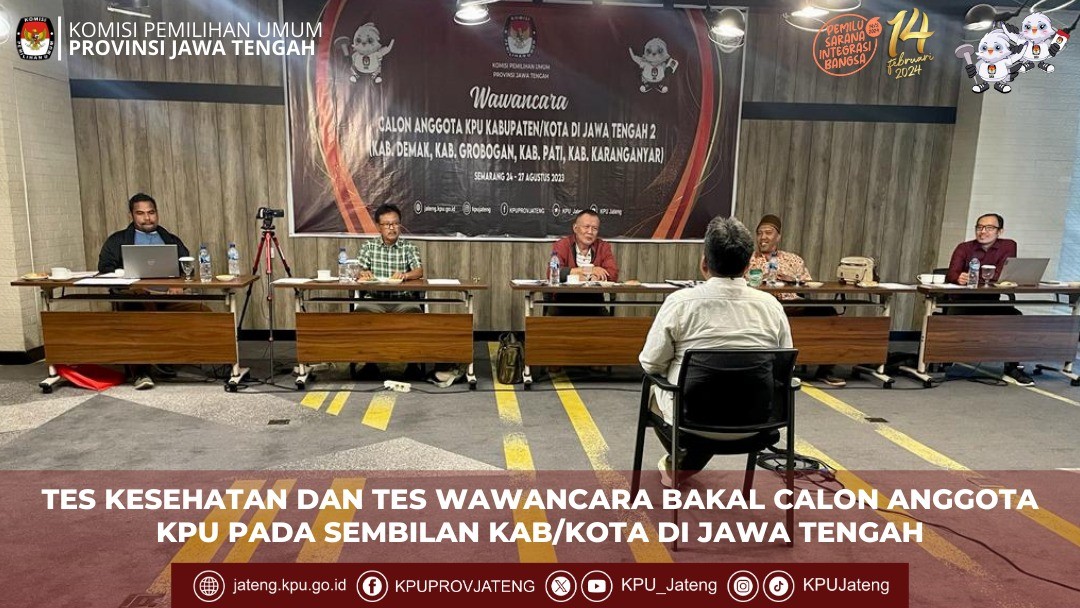 (27/8) Tim Seleksi Anggota KPU pada sembilan Kabupaten/Kota di Jawa Tengah menyelenggarakan Tes Pemeriksaan Kesehatan dan Tes Wawancara bagi Calon Anggota KPU Gelombang 7 pada sembilan Kabupaten/Kota di Provinsi Jawa Tengah berjumlah 180 peserta yang sebelumnya telah dinyatakan lolos Seleksi Tertulis dan Tes Psikologi. Tes pemeriksaan kesehatan diselenggarakan bekerja sama dengan Tim Kesehatan TNI AD di RS TNI Bhakti Wira Tamtama Semarang, dimulai dari wilayah Jateng 1 pada hari Selasa tanggal 22 Agustus 2023. Kemudian dilanjutkan wilayah Jateng 2 pada hari Rabu tanggal 23 Agustus 2023. Selanjutnya, tes wawancara metode Panel dengan Tim Seleksi, Jateng 1 dan Jateng 2 diselenggarakan pada hari dan tempat yang sama, yaitu hari Kamis s/d Minggu, tanggal 24-27 Agustus 2023 bertempat di Hotel Room Inc Kota Semarang. Hasil dari Tes Kesehatan dan Tes Wawancara akan diumumkan pada tanggal 31 Agustus s/d 01 September 2023, sesuai dengan Perubahan atas Keputusan KPU Nomor 891 Tahun 2023 tentang Jadwal Tahapan Pelaksanaan Calon Anggota KPU Kab/Kota pada 26 Kab/Kota di 6 Provinsi Periode 2023-2028.