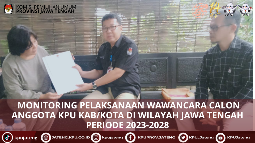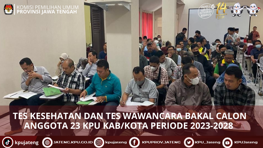 Semarang (27/07) Tim Seleksi Anggota KPU pada 23 Kabupaten/Kota di Jateng menyelenggarakan Tes Pemeriksaan Kesehatan dan Tes Wawancara bagi Calon Anggota KPU pada 23 Kabupaten/Kota di Provinsi Jawa Tengah yang berjumlah 460 peserta yang sebelumnya telah dinyatakan lolos Seleksi Tertulis dan Tes Psikologi. Tes pemeriksaan kesehatan diselenggarakan bekerja sama dengan Tim Kesehatan TNI AD di RS TNI Bhakti Wira Tamtama Semarang, dimulai dari wilayah Jateng 1 pada hari Selasa s.d Rabu tanggal 18-19 Juli 2023. Kemudian dilanjutkan wilayah Jateng 2 pada hari Selasa s.d Kamis tanggal 18-20 Juli 2023. Wilayah Jateng 3 pada hari Rabu s.d Jum'at tanggal 19-21 Juli 2023. Wilayah Jateng 4 hari Kamis s.d Sabtu tanggal 20-22 Juli 2023. Sedangkan wilayah Jateng 5 pada hari jum'at s.d sabtu tanggal 21-22 Juli 2023. Selanjutnya, tes wawancara metode Panel dengan Tim Seleksi, dilaksanakan pada hari Sabtu s/d Selasa tanggal 22-25 Juli 2023 di Java Heritage Hotel Purwokerto untuk wilayah Jateng 1. Sedangkan wilayah Jateng 2 di hari dan tanggal yang sama bertempat di Hotel Santika Premiere Semarang. Selain itu, wilayah Jateng 3 juga menyelenggarakan di hari dan tanggal yang sama bertempat di Grand Mercure Solo Baru Sukoharjo. Kemudian wilayah Jateng 4 diselenggarakan pada hari Sabtu s.d Senin tanggal 22-24 Juli 2023 di Hotel Patra Jasa Semarang. Sedangkan wilayah jateng 5 menyelenggarakan tes wawancara pada hari senin s.d selasa tanggal 24-25 Juli 2023 di Hotel Grand Arkenso Semarang. Hasil dari Tes Kesehatan dan Tes Wawancara akan diumumkan pada 29-30 Juli 2023, sesuai dengan Keputusan KPU Nomor 557 Tahun 2023 tentang Jadwal Tahapan Pelaksanaan Calon Anggota KPU Kab/Kota pada 91 Kab/Kota di 9 Provinsi Periode 2023-2028.