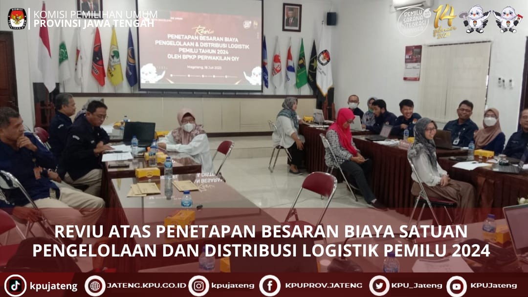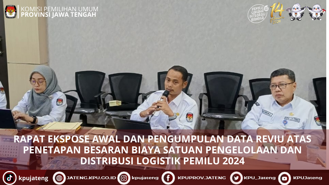 Semarang (17/7) Sekretaris KPU Provinsi Jawa Tengah, Rudinal Menghadiri Rapat Ekspose Awal dan Pengumpulan Data Reviu atas Penetapan Besaran Biaya Satuan Pengelolaan dan Distribusi Logistik Pemilu 2024 di Kantor BPKP Perwakilan Provinsi Jawa Tengah. Pelaksanaan kegiatan tersebut untuk menindaklanjuti Surat Sekretaris Jenderal Jenderal KPU RI Nomor : 2446/PW.02-SD/11/2023 tanggal 7 Juli 2023 perihal Penetapan Besaran Biaya Pengelolaan Logistik Pemilu Tahun 2024, dengan tujuan perlunya perencanan anggaran yang akuntabel, sehingga kegiatan logistik dapat terukur dan dapat dipertanggungjawabkan dengan mengacu kepada indeks harga setempat dan pengupahan dengan pendekatan standar upah minimum Kabupaten/Kota (UMK). Rapat dilaksanakan secara hybrid dihadiri oleh BPKP Perwakilan Provinsi Jawa Tengah, BPKP Perwakilan DIY, 35 Satker KPU Kabupaten/Kota Se- Jawa Tengah. Turut mengikuti Kabag Keuangan, Umum dan Logistik, Eko Supriyono, Kasubbag Umum dan Logistik, Dafidh Myharta. S dan Staf Pengelola Logistik B. Eko Setyawati.