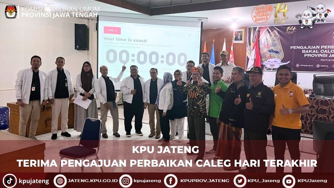 Semarang (10/7) KPU Jateng menerima pengajuan perbaikan dokumen persyaratan bakal calon anggota DPRD Provinsi pada hari terakhir yakni Hari Minggu tanggal 09 Juli 2023, mulai pukul 08:00 hingga 23:59. Satu bakal calon anggota DPD yang mengajukan pada hari terakhir ialah Ahmad Baligh Mu'aidi yang datang di Kantor KPU pada pukul 17:50. Sedangkan Partai politik yang mengajukan pertama pada hari tersebut ialah PKB yang datang pada pukul 09:07. Disusul oleh Perindo pada pukul 11:06. Diikuti PDIP pada pukul 14:09. Partai Buruh pukul 15:00. Partai Nasional Demokrat pukul 15:37. Partai GERINDRA hadir pukul 15:47. Partai DEMOKRAT hadir pukul 17:08. Partai Amanat Nasional hadir pada pukul 17:29 dan melakukan daftar ulang pukul 19:33. Partai GELORA hadir pada pukul 17:31 dan melakukan daftar ulang pukul 19:33. Golkar hadir pukul 19:10 dan melakukan daftar ulang pukul 20:54. Partai Kebangkitan Nusantara hadir pada pukul 19:45. Partai GARUDA hadir pukul 20:06. Partai UMMAT hadir pada pukul 20:20 dan dilakukan daftar ulang hingga 2x yakni pada pukul 22:51 dan 23:30. Partai Solidaritas Indonesia hadir pukul 21:22. Partai Persatuan Pembangunan hadir pada pukul 21:27 dan melakukan daftar ulang pukul 23:16. Partai Keadilan Sejahtera hadir pada pukul 22:37. Partai Bulan Bintang hadir pukul 23:00. Dan Partai HANURA hadir pada pukul 23:24.