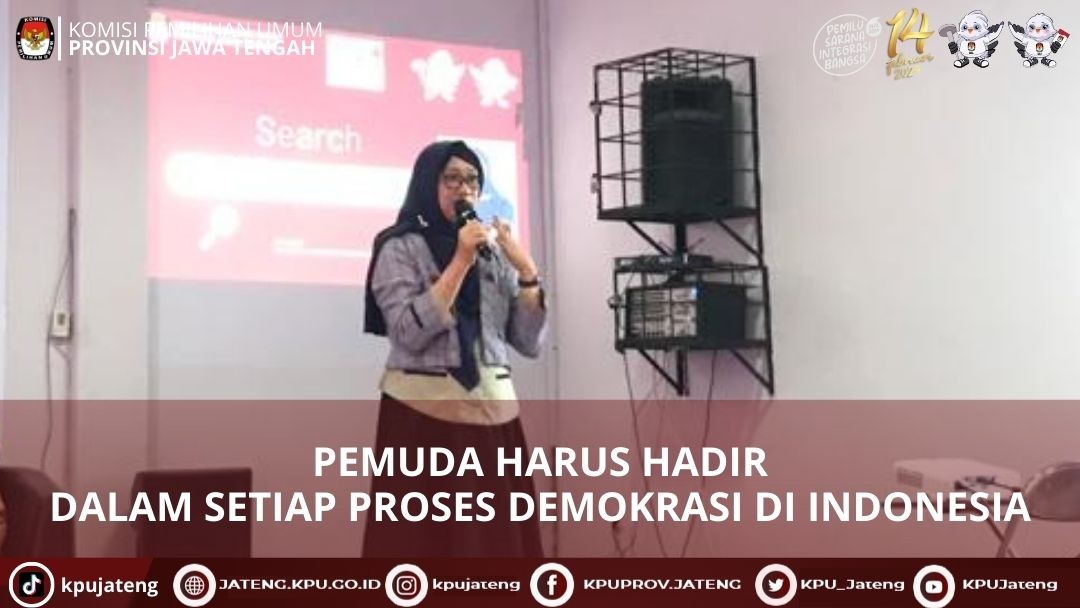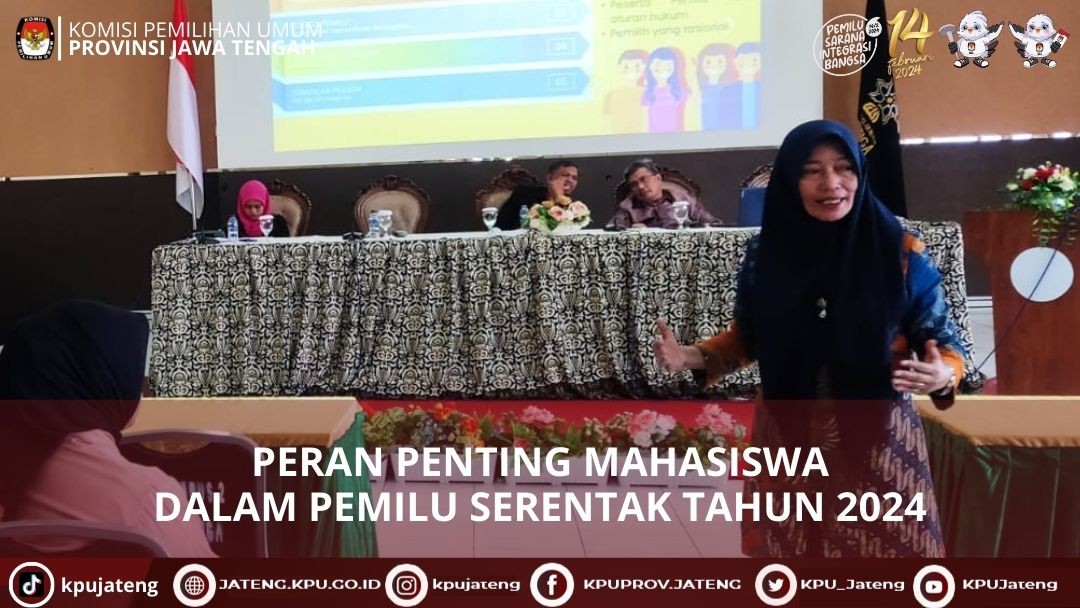 Kadiv Teknis Penyelenggara Pemilu KPU Jateng, Putnawati, hadir menjadi salah satu narasumber diacara tersebut. Putnawati menyapa para peserta dan menyampaikan materi tentang Peran Penting Mahasiswa dalam Pemilu Serentak Tahun 2024. Pada kegiatan tersebut, Putnawati menyampaikan bahwa pemilu dapat menjadi sarana pemersatu bangsa, karena tanpa adanya pemilu, Indonesia dapat saja tercerai berai karena perbedaan pandangan politik, kepentingan dan lainnya. Tapi dengan pemilu, perbedaan pandangan politik dapat menyatu dalam bingkai Negara Republik Indonesia.