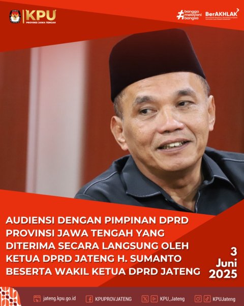 Semarang— Komisi Pemilihan Umum (KPU) Provinsi Jawa Tengah melaksanakan audiensi dengan Pimpinan Dewan Perwakilan Rakyat Daerah (DPRD) Provinsi Jawa Tengah, Selasa (3/6/2025), di Gedung DPRD Jawa Tengah, Semarang. Audiensi ini menjadi bagian dari agenda KPU dalam memperkuat sinergi antar-lembaga dan membangun kolaborasi untuk peningkatan kualitas demokrasi di Jawa Tengah. Rombongan KPU Jawa Tengah dipimpin langsung oleh Ketua KPU Jateng, Handi Tri Ujiono, dan diterima oleh Ketua DPRD Jawa Tengah, H. Sumanto, beserta Wakil Ketua DPRD. Dalam forum tersebut, Ketua KPU Jateng memaparkan capaian kinerja lembaga selama penyelenggaraan Pemilihan Gubernur dan Wakil Gubernur Jawa Tengah Tahun 2024. Laporan tersebut mencakup seluruh tahapan pemilihan, mulai dari perencanaan program dan anggaran, pemutakhiran data pemilih, fasilitasi kampanye, logistik pemilu, hingga pemungutan dan rekapitulasi suara. Pimpinan DPRD menyambut baik laporan dan inisiatif KPU tersebut. Ketua DPRD Jateng, H. Sumanto, menyampaikan apresiasi atas profesionalisme dan dedikasi KPU dalam mengawal proses demokrasi di provinsi ini. Ia menegaskan komitmen DPRD untuk mendukung kerja-kerja KPU dalam membangun tata kelola pemilu yang semakin baik. Sebagai penutup audiensi, Ketua dan Anggota KPU Jawa Tengah menyerahkan buku Laporan Penyelenggaraan Pemilihan Gubernur dan Wakil Gubernur Jawa Tengah Tahun 2024 kepada pimpinan DPRD Jawa Tengah, sebagai bentuk pertanggungjawaban publik sekaligus dokumentasi kelembagaan.