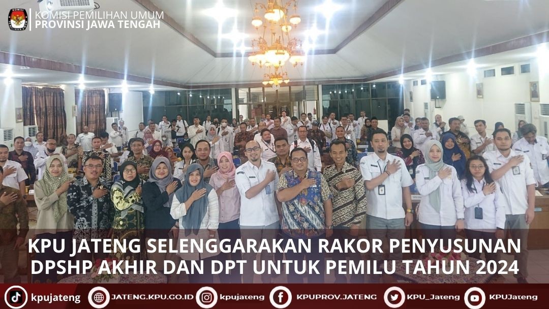 Kamis, 25 Mei 2023, KPU Provinsi Jawa Tengah menyelenggarakan Rapat Koordinasi Penyusunan Daftar Pemilih Sementara Hasil Perbaikan Akhir (DPSHP akhir) dan Persiapan Daftar Pemilih Tetap (DPT) untuk Pemilu Tahun 2024. Acara yang dihadiri oleh Anggota KPU Divisi Data dan Informasi, Kasubbag Perencanaan, data dan informasi serta operator Sidalih KPU Kabupaten/Kota se Jawa Tengah diadakan di Aula KPU Provinsi Jawa Tengah ini telah diselenggaran selama 2 (dua) hari sejak 24 Mei 2023.