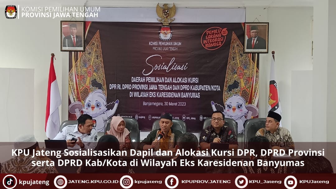 KPU Provinsi Jawa Tengah menyelenggarakan Sosialisasi Dapil dan Alokasi Kursi DPR, DPRD Provinsi dan DPRD Kab/Kota di wilayah eks karesidenan Banyumas. Kegiatan ini diselenggarakan hari Kamis, 30 Maret 2023 di Kantor KPU Kab. Banjarnegara. Kegiatan ini diikuti oleh KPU Kab/Kota di wilayah eks karesidenan Banjarnegara, Stakeholder, Bawaslu, LSM/Ormas, tokoh masyarakat, akademisi, dan media massa. Dalam kegiatan ini, Kadiv. Teknis Penyelenggaraan Pemilu, Putnawati menyampaikan bahwa Dapil DPR RI, DPRD Provinsi dan DPRD Kab/Kota telah ditetapkan KPU RI pada tanggal 9 Februari 2023. Dapil menjadi dasar bagi partai politik untuk menentukan siapa yang diajukan sebagai caleg. Henry Wahyono, Kadiv. Data dan Informasi yang turut hadir dalam kegiatan menyampaikan bahwa untuk menentukan suatu dapil KPU mengedepankan 7 prinsip, diantaranya kesetaraan nilai suara, ketaatan pada sistem pemilu yang proporsional, proporsionalitas, integralitas wilayah, berada dalam cakupan wilayah yang sama, serta kohesivitas dan kesinambungan. Ikhwanuddin, Kadiv. Perencanaan dan Logistik juga menambahkan bahwa makna yang penting dari penyusunan dapil adalah bagaimana kita bisa mengevaluasi para wakil yang telah kita pilih pada tahun sebelumnya apakah sudah memberikan fungsi yang maksimal dalam keterwakilan dan harus disosialisasikan kepada masyarakat. Ada 6 syarat pemilu bisa terlaksana diantaranya adanya regulasi, adanya Penyelenggara Pemilu,adanya Peserta Pemilu,adanya Pemilih, adanya waktu pelaksanaan serta adanya Dapil. Kegiatan Sosialisasi Dapil dan Alokasi Kursi DPR, DPRD Provinsi dan DPRD Kab/Kota diselenggarakan untuk mensosialisasikan penataan Dapil DPR, DPRD Provinsi dan DPRD Kabupaten/Kota di wilayah eks karesidenan Banyumas sebagaimana telah ditetapkan dalam Peraturan KPU Nomor 6 Tahun 2023