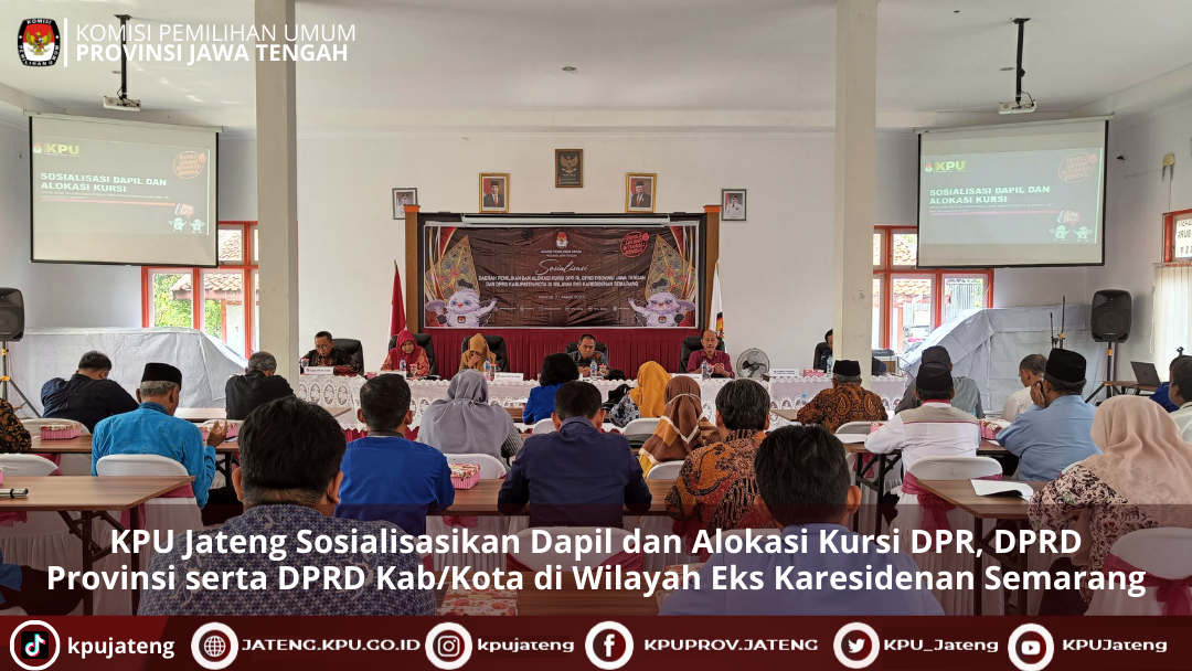KPU Provinsi Jawa Tengah menyelenggarakan Sosialisasi Dapil dan Alokasi Kursi DPR, DPRD Provinsi dan DPRD Kab/Kota di wilayah eks karesidenan Semarang. Kegiatan ini diselenggarakan hari Selasa, 21 Maret 2023 di Ruang Rapat Kantor KPU Kab. Kendal. Kegiatan ini diikuti oleh KPU Kab/Kota di wilayah eks karesidenan Semarang, Stakeholder, Bawaslu, LSM/Ormas, tokoh masyarakat, akademisi, dan media massa. Kegiatan ini diselenggarakan untuk mensosialisasikan penataan Dapil DPR, DPRD Provinsi dan DPRD Kabupaten/Kota di wilayah eks karesidenan Semarang. sebagaimana telah ditetapkan dalam Peraturan KPU Nomor 6 Tahun 2023.