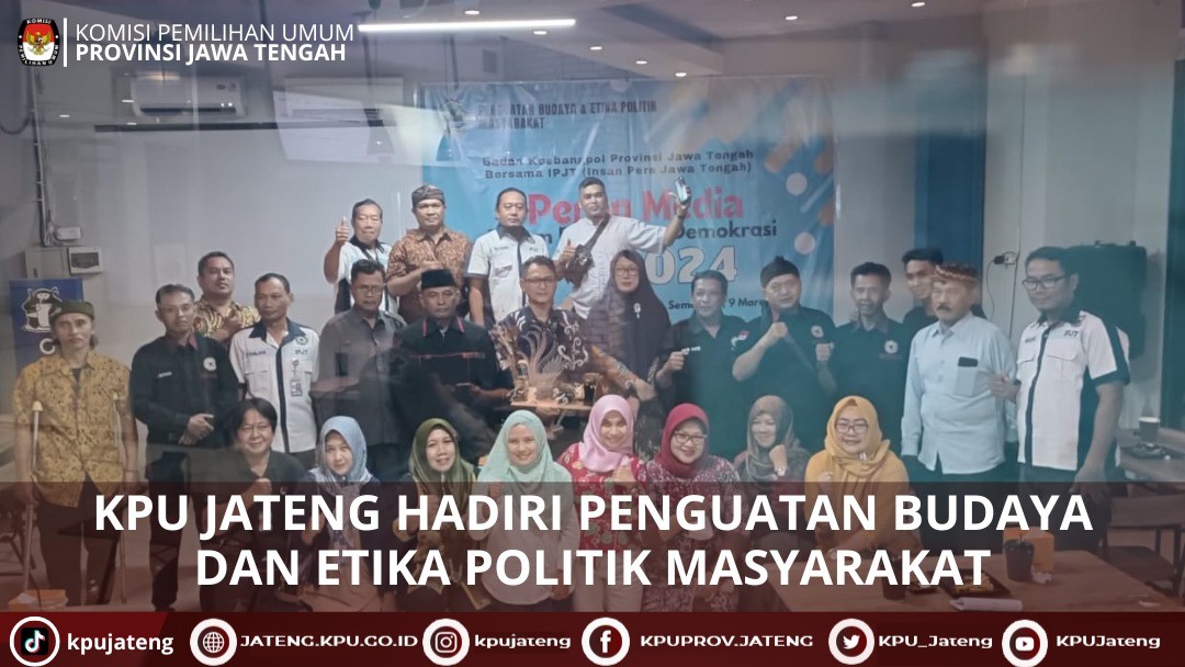 Semarang (9/3) KPU Provinsi Jawa Tengah hadir memberikan paparan pada kegiatan penguatan budaya dan etika politik masyarakat yang mengusung tema Peran Media dalam Penguatan Demokrasi 2024 yang digagas oleh Badan Kebangpol Provinsi Jawa Tengah, pada hari Kamis, 9 Maret 2023.