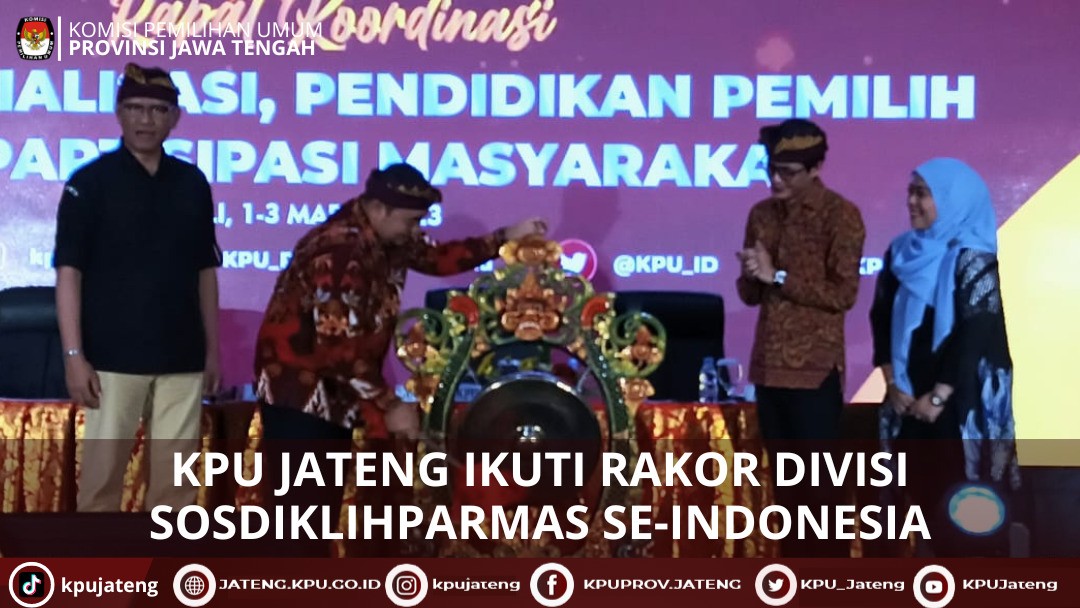 Bali (3/3) Anggota KPU Provinsi Jawa Tengah, Eni Misdayani didampingi Kasubbag Parmas, Nuke W. hadir pada kegiatan Rakor Divisi Sosdiklihparmas KPU Provinsi se-Indonesia yang diselenggarakan oleh KPU RI di Bali selama 3 (tiga) hari sejak tanggal 1 hingga 3 Maret 2023.