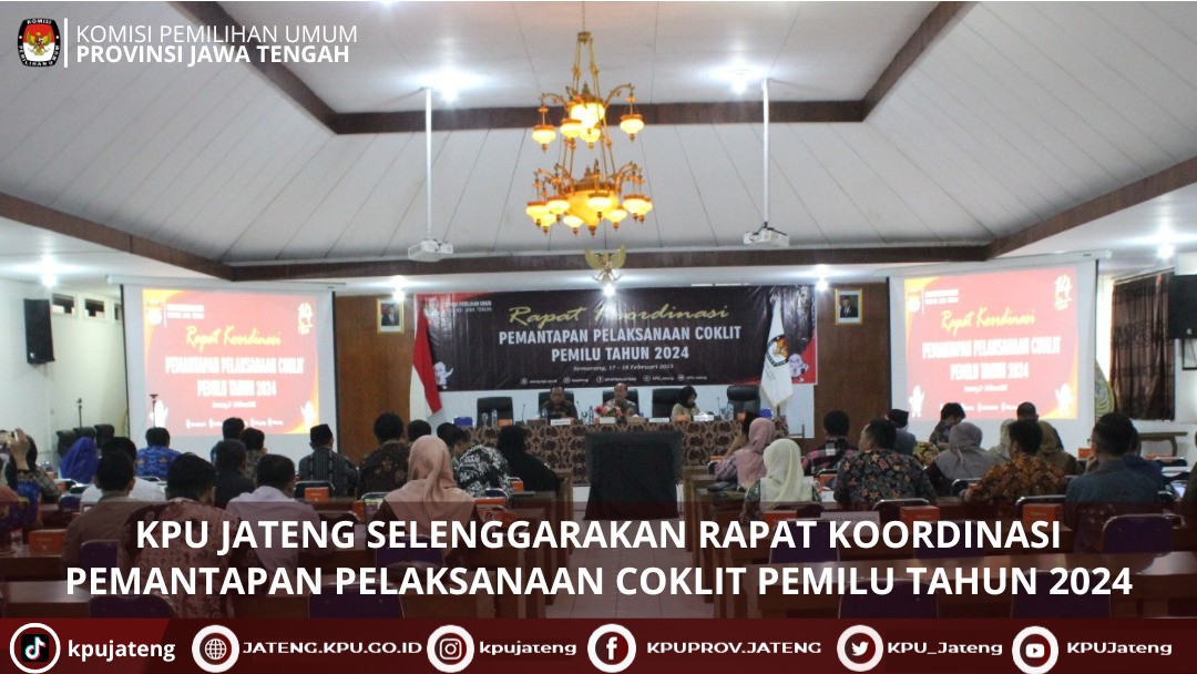 Semarang (18/02) KPU Provinsi Jawa Tengah menyelenggarakan Rapat Koordinasi Pemantapan Pelaksanaan Coklit Pemilu Tahun 2024 selama 2 hari dari tanggal 17 s.d 18 Februari 2023. Kegiatan yang diselenggarakan di Aula Kantor KPU Provinsi Jawa Tengah dihadiri oleh Bawaslu Provinsi, Dispermadesdukcapil, serta diikuti oleh Anggota KPU Kabupaten/Kota se Jawa Tengah dan Admin/operator Sidalih KPU Kabupaten/Kota.