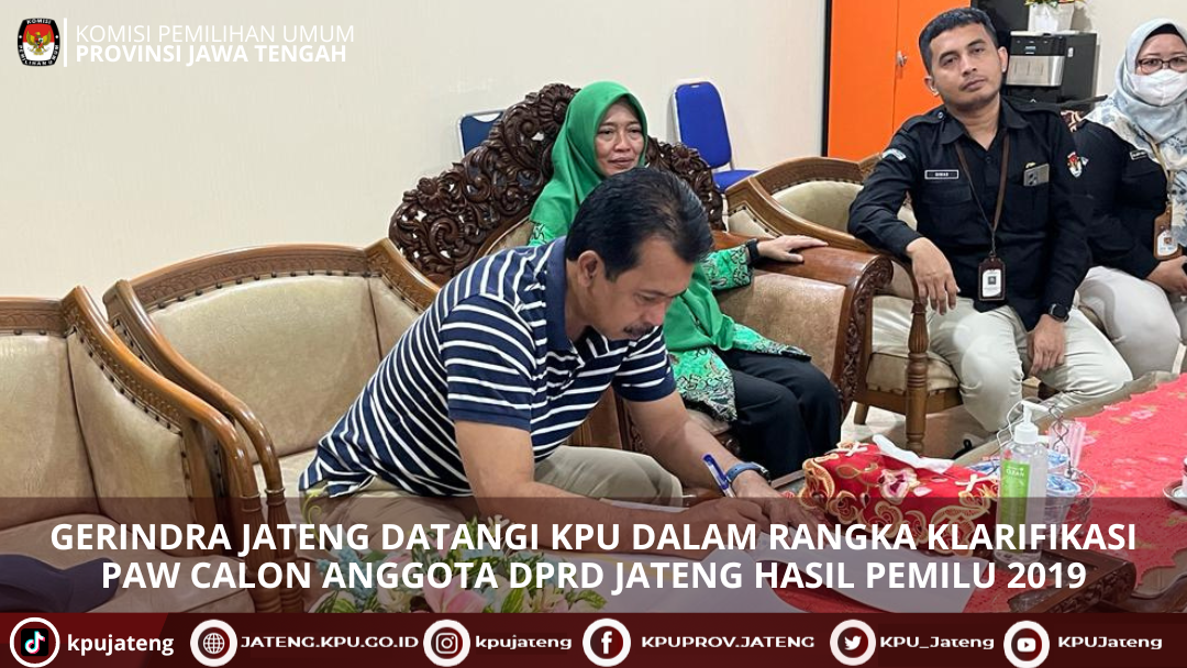 Semarang (1/2) Ketua KPU Provinsi Jawa Tengah, Paulus Widiyantoro bersama Ketua Div. Teknis Penyelenggaraan Pemilu, Putnawati didampingi Kasubbag TPP, Dimas D. Narottama menerima kedatangan Sekretaris DPD Partai Gerindra Jateng, Sriyanto Saputro dalam rangka melakukan klarifikasi calon Pengganti Antar Waktu (PAW) Anggota DPRD Provinsi Jawa Tengah Hasil Pemilihan Umum Tahun 2019 untuk Partai Gerindra di daerah pemilihan Jawa Tengah 7 yang wilayahnya meliputi Kabupaten Klaten, Kabupaten Sukoharjo dan Kota Surakarta.Turut hadir calon PAW Anggota DPRD Provinsi, Djoni Kristijanto yang memiliki peringkat suara terbanyak berikutnya pada dapil tersebut. Putnawati menyampaikan bahwa pimpinan DPRD Provinsi Jawa Tengah telah menyampaikan surat permohonan usulan penggantian antarwaktu Anggota DPRD Provinsi Jawa Tengah. Berdasarkan ketentuan Peraturan KPU Nomor 6 Tahun 2017 sebagaimana telah diubah dengan Peraturan KPU Nomor 6 Tahun 2019, KPU Provinsi melakukan verifikasi paling lama 5 (lima) hari sejak diterimanya nama Anggota DPRD Provinsi yang berhenti antarwaktu dari Pimpinan DPRD Provinsi. Dalam proses verifikasi, KPU Provinsi Jawa Tengah diantaranya juga melakukan klarifikasi kepada pengurus partai politik dan calon PAW dalam rangka memastikan calon PAW masih memenuhi persyaratan yang telah ditentukan regulasi sebagai pengganti antarwaktu H. Mujaeroni, SH, MH yang telah meninggal dunia beberapa waktu lalu. Selanjutnya, KPU Provinsi Jawa Tengah akan melakukan pleno untuk menyampaikan nama usulan PAW kepada pimpinan DPRD Provinsi.