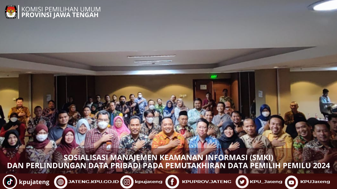KPU Provinsi Jawa Tengah menyelenggarakan Sosialisasi Sistem Manajemen Keamanan Informasi (SMKI) dan Perlindungan Data Pribadi Pada Pemutakhiran Data Pemilih Pemilu 2024, Jumat, 16 Desember 2024 di Hotel Grand Edge Semarang.