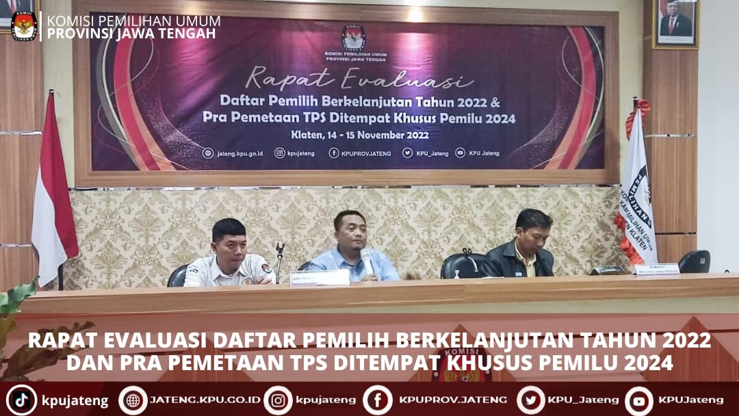Klaten (14/11/22) KPU Provinsi Jawa Tengah melaksanakan Rapat Evaluasi Daftar Pemilih Berkelanjutan Tahun 2022 dan Pra Pemetaan TPS Ditempat Khusus Pemilu 2024 pada tanggal 14-15 November 2022 di Kantor KPU Kabupaten Klaten. Kegiatan diikuti oleh Anggota KPU Divisi Perencanaan, Data dan Informasi, Kasubbag Perencanaan, Data dan Informasi serta Operator Sidalih KPU Kabupaten/Kota se Jawa Tengah. Pembukaan kegiatan pada hari pertama, dibuka dengan sambutan dan arahan oleh Anggota KPU Provinsi Jawa Tengah Ketua Divisi Data dan Informasi, Henry Wahyono. Henry menyampaikan DPB adalah proses pemutakhiran data pemilih berdasarkan daftar pemilih tetap pemilu terakhir, kegiatan DPB ini telah dilaksanakan sejak tahun 2020 oleh KPU Kabupaten/Kota. Kegiatan ini juga dihadiri oleh Anggota Bawaslu Provinsi Jawa Tengah, Heru Cahyono. Heru menyampaikan apresiasi atas kerja KPU dalam proses DPB, serta mengingatkan agar daftar pemilih dapat selesai semaksimal mungkin ditingkat KPU Kabupaten/Kota.